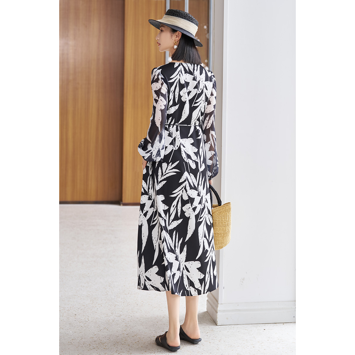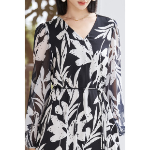 v领长袖 2025新款 显瘦休闲收腰气质短裙胖mm 碎花连衣裙女秋季 大码