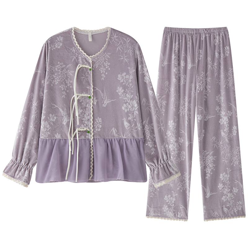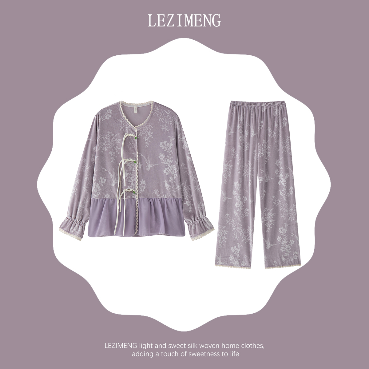 国风家居服套装 加绒保暖新中式 新款 乐姿梦紫色金丝绒睡衣女秋冬季