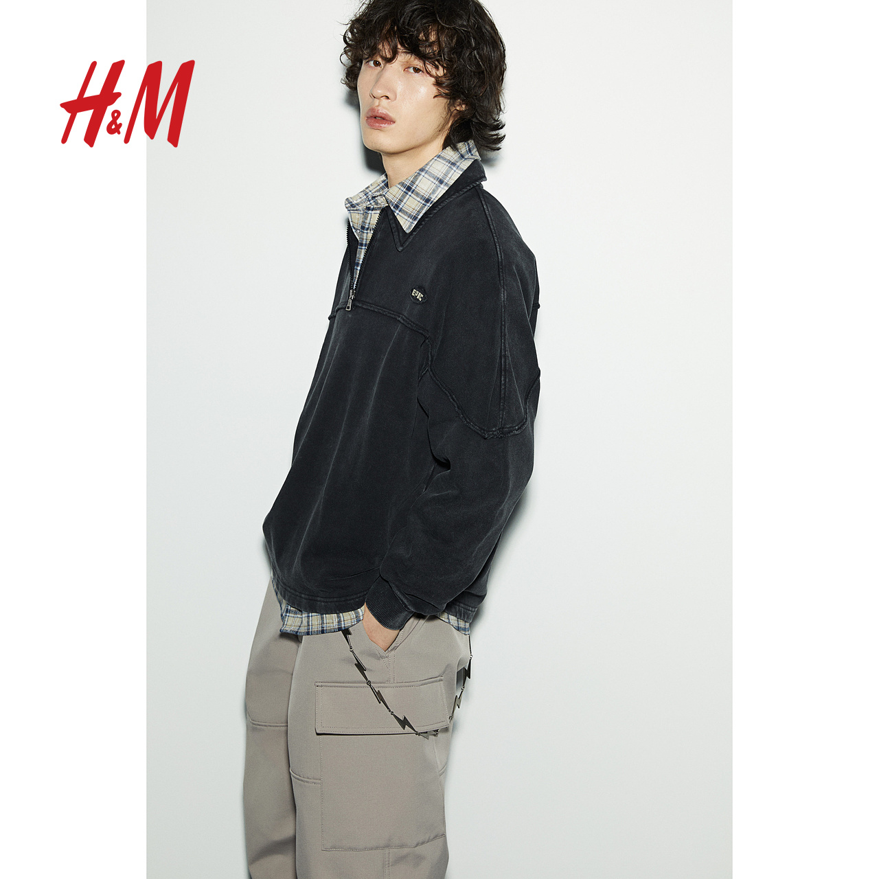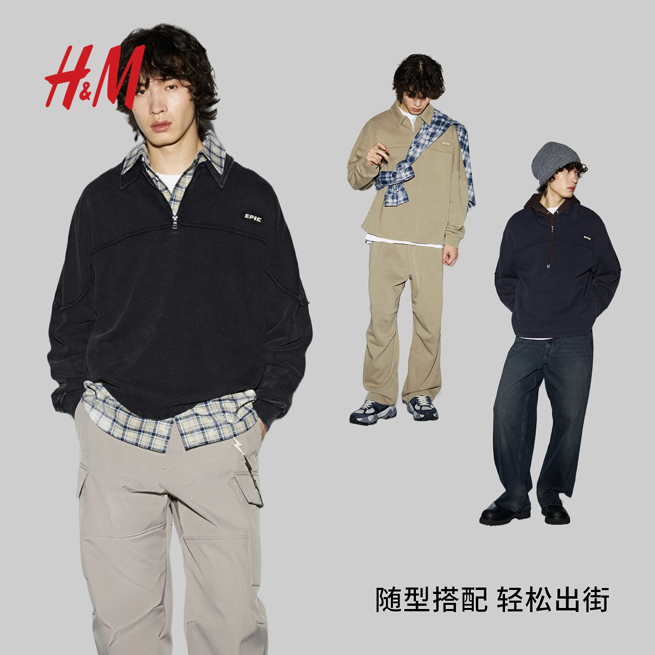 加绒宽松柔软长袖 卫衣秋季 翻领上部拉链上衣1238538 女装 HM男装
