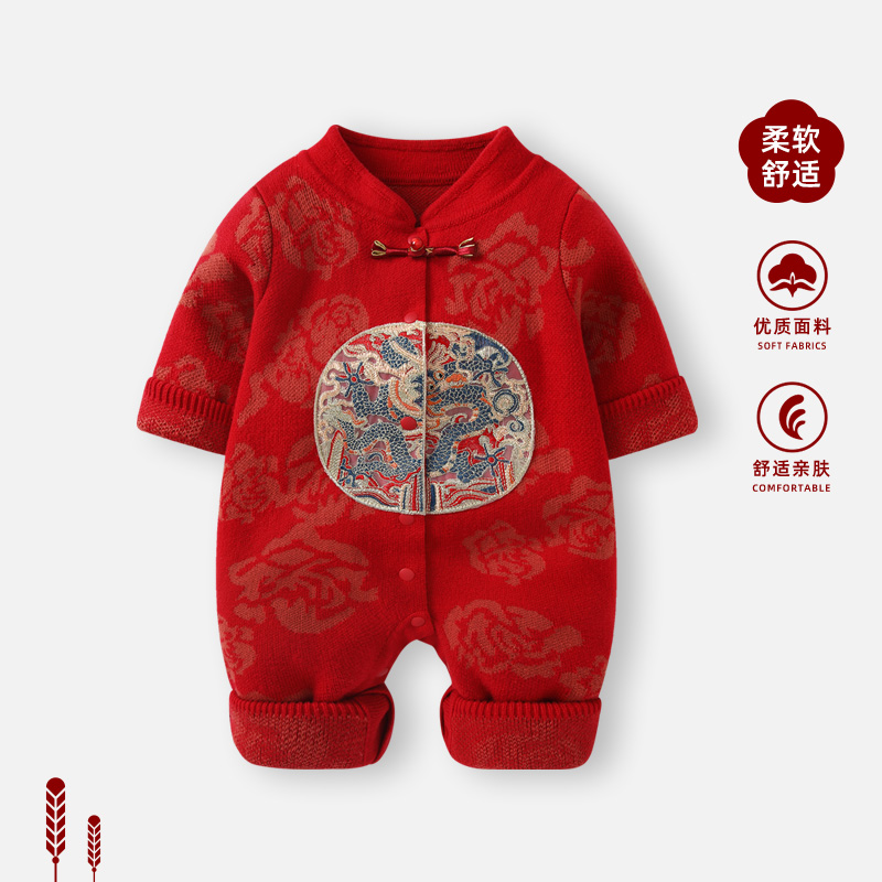 婴儿衣服秋冬男宝宝红色满月周岁礼服国风针织连体衣幼儿冬装 套装