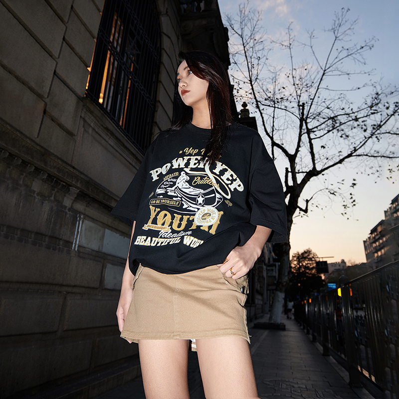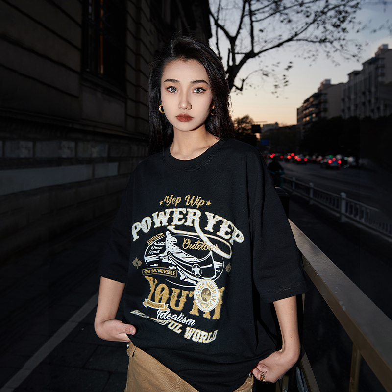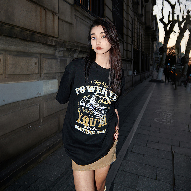 t恤女2025新款 打底衫 夏季 印花半袖 潮 宽松街头美式 YEP复古黑色短袖