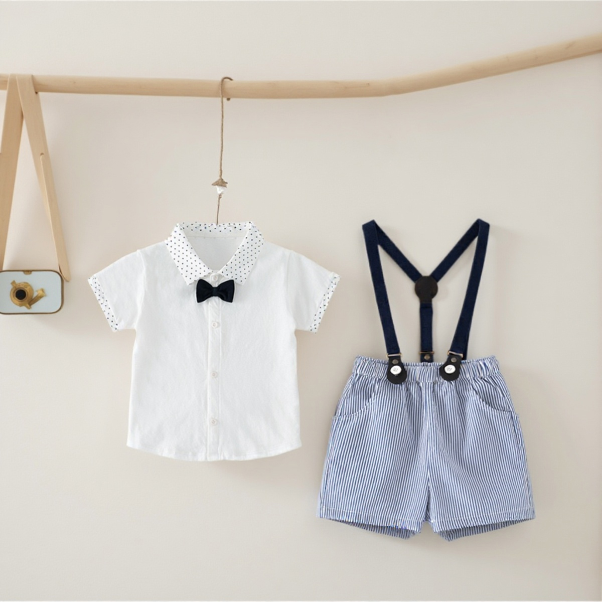 夏季 韩系2025小少爷男童短袖 套装 背带裤 一周岁礼服宝宝两件套 衬衫