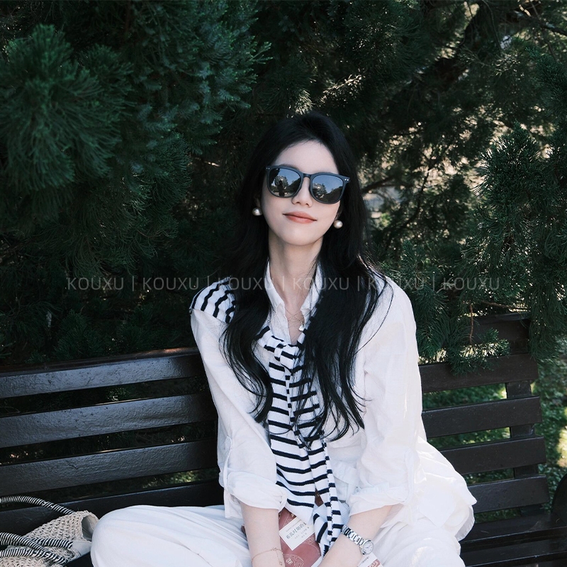 防晒上衣 穿搭女条纹披肩翻领宽松百搭长袖 ootd 日常通勤韩系衬衫