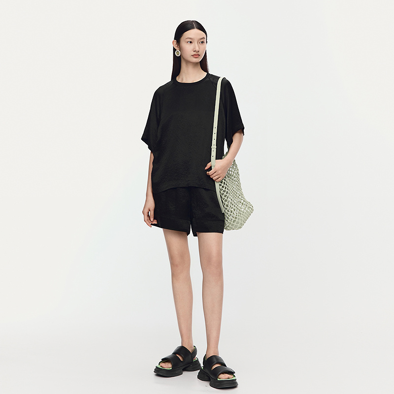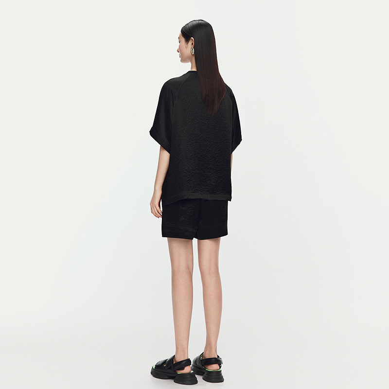 微绉缎感肌理短袖 新款 AUM噢姆2025年夏季 T恤黑色短裤 轻松套装