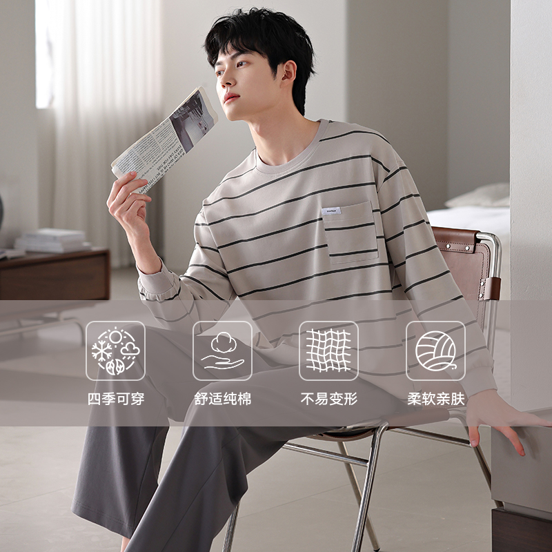 家居服套装 长裤 套头睡衣可外穿简约2025年春秋新长袖 雅鹿全棉男士