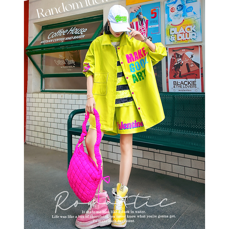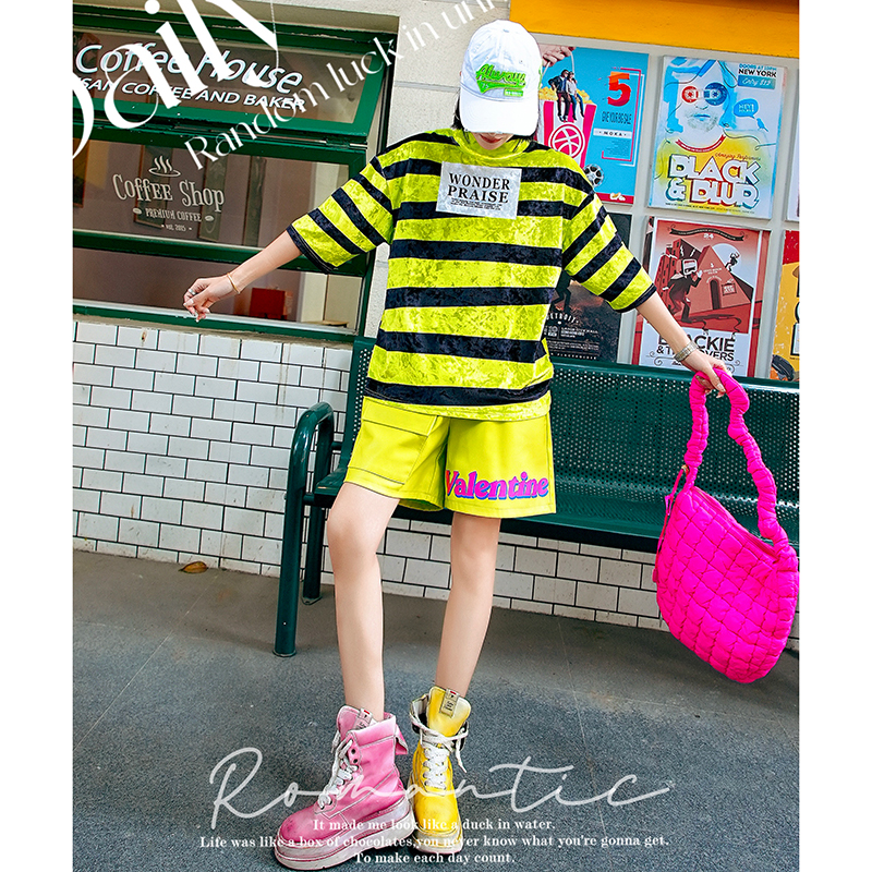 字母图案丝绒潮牌显瘦打底衫 YHAY荧光绿黑色条纹休闲T恤春季 新款