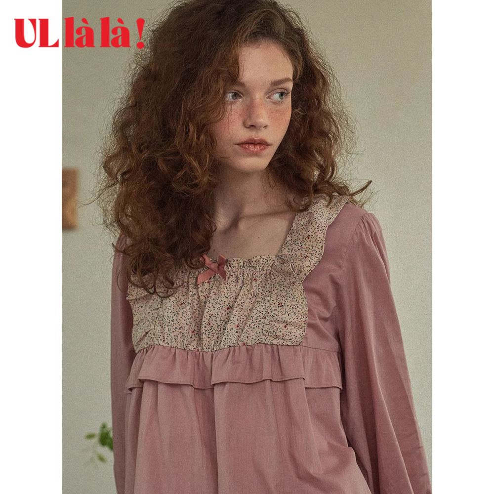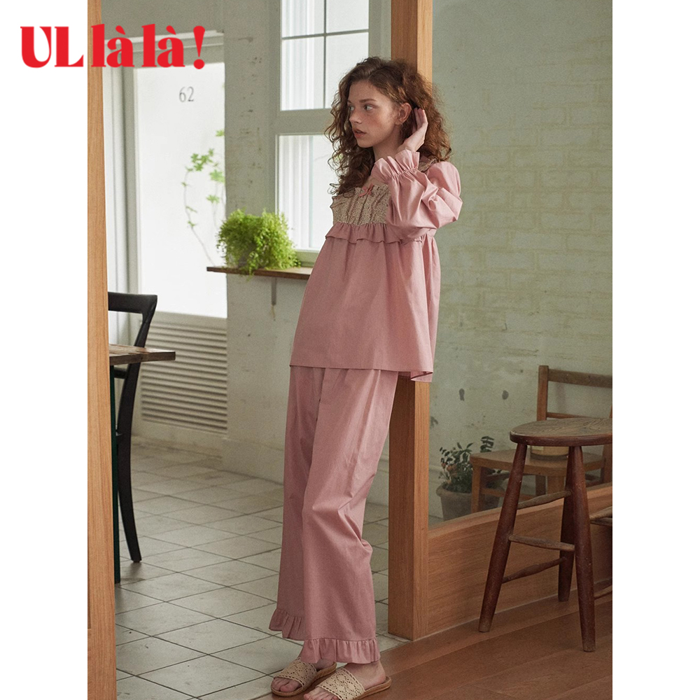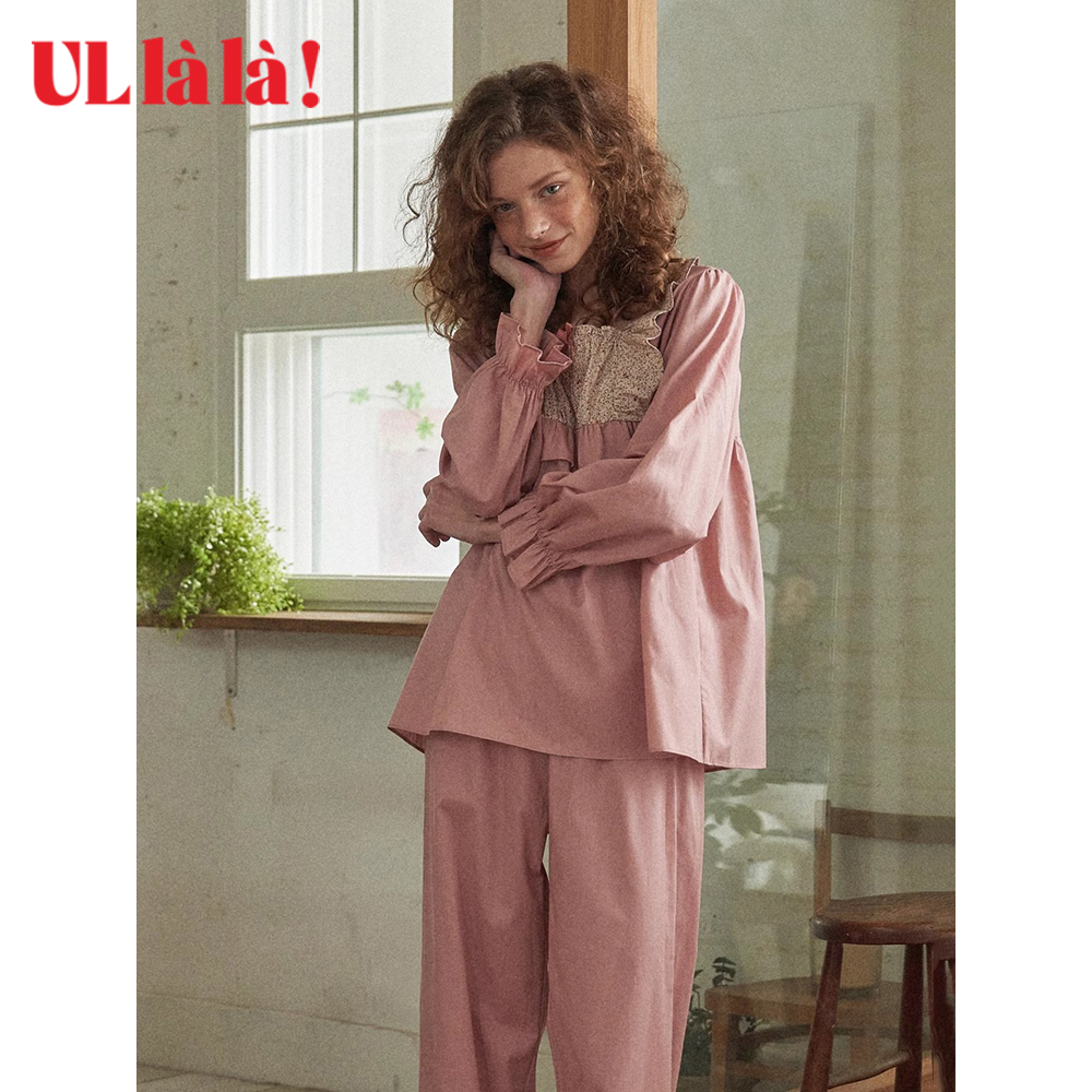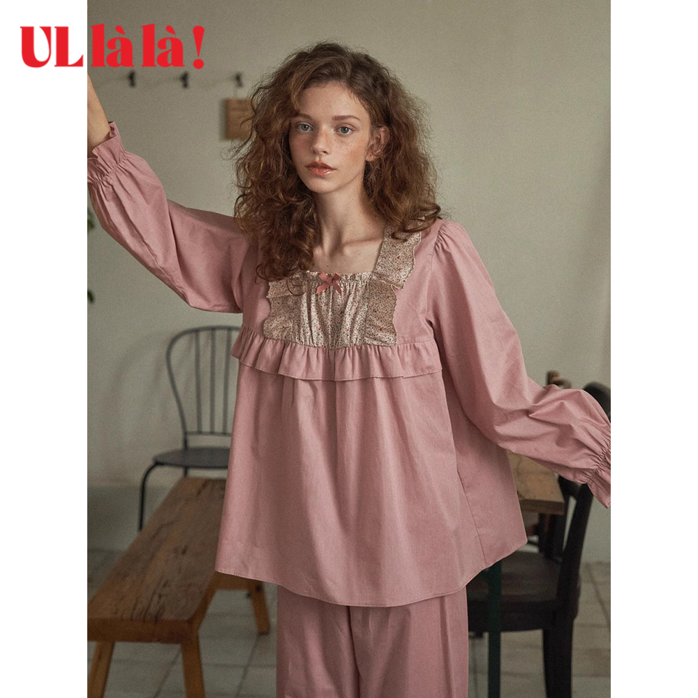家居服乌拉拉 长袖 Ullala秋冬新品 甜美纯棉宽松女方领休闲睡衣睡裤