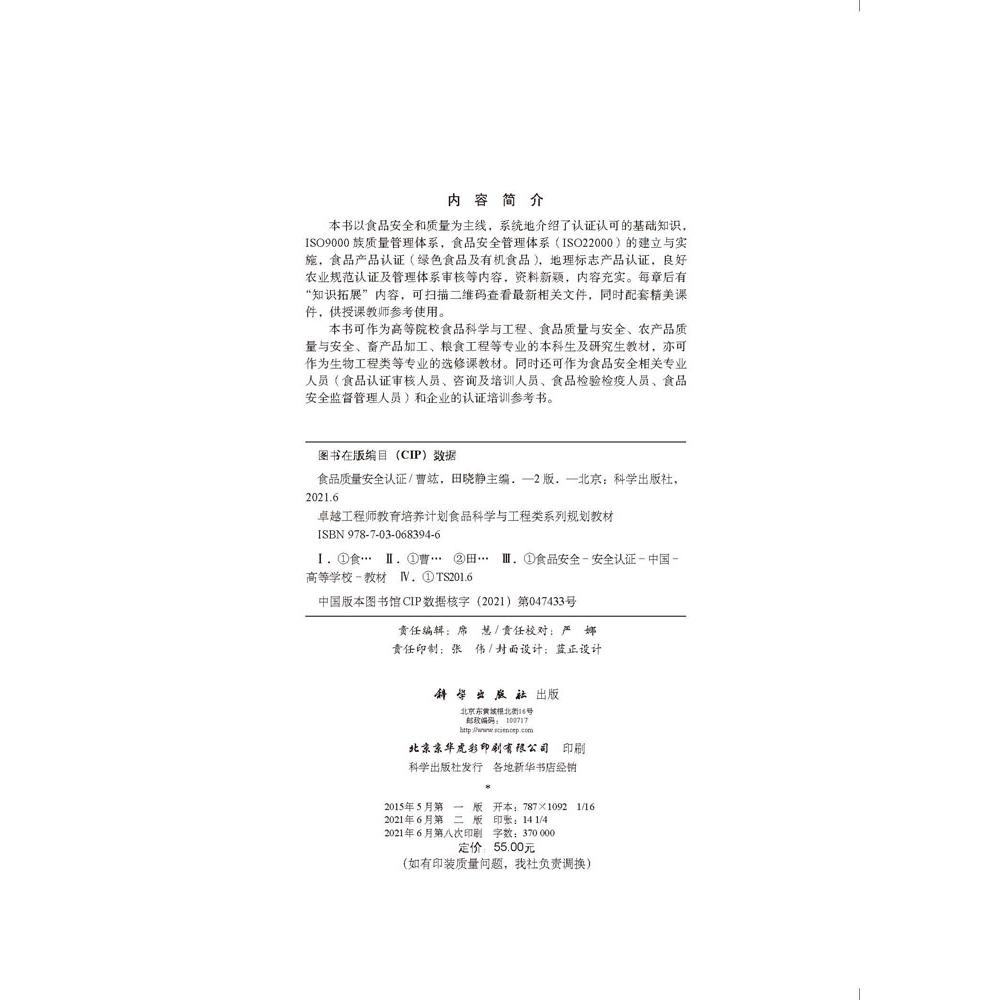 食品质量安全认证 科学出版 第二版 田晓静 社 曹竑 全新正版