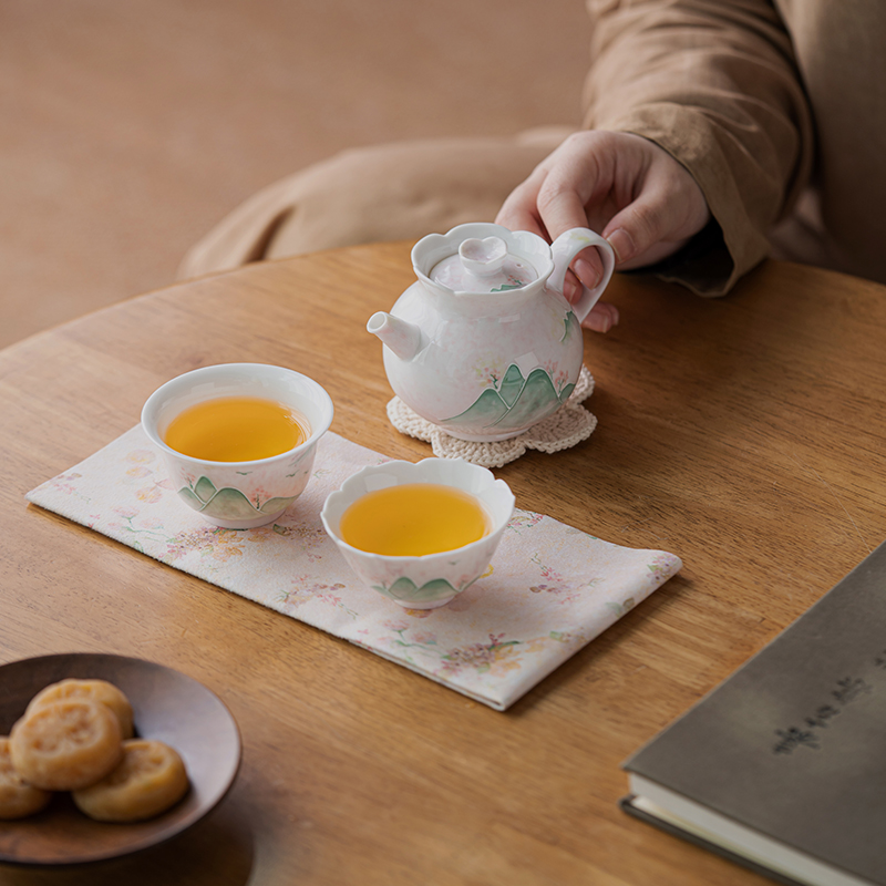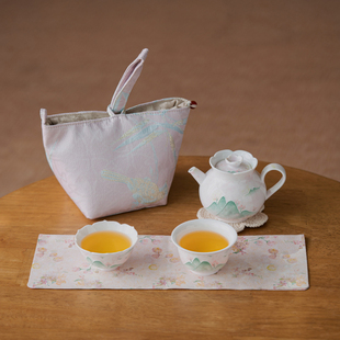 画续手绘远山花口壶旅行装 收纳 一壶二杯功夫旅行茶具陶瓷便携式