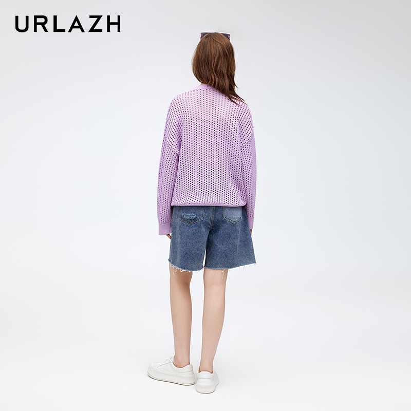 URLAZH有兰新款 温柔气质设计感薰衣草粉紫色落肩镂空针织毛衣女