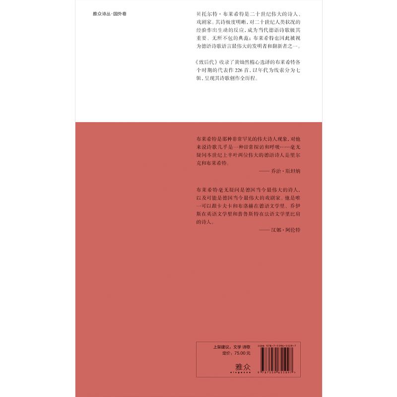 现货正版 雅众诗丛系列 致后代 黄灿然选译其全阶段代表作226首 外国德语诗歌伟大革新者戏剧史诗剧大师文学书籍 布莱希特诗选
