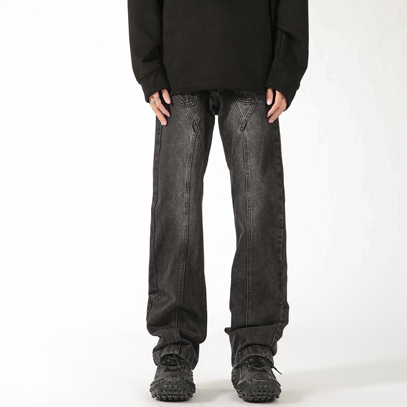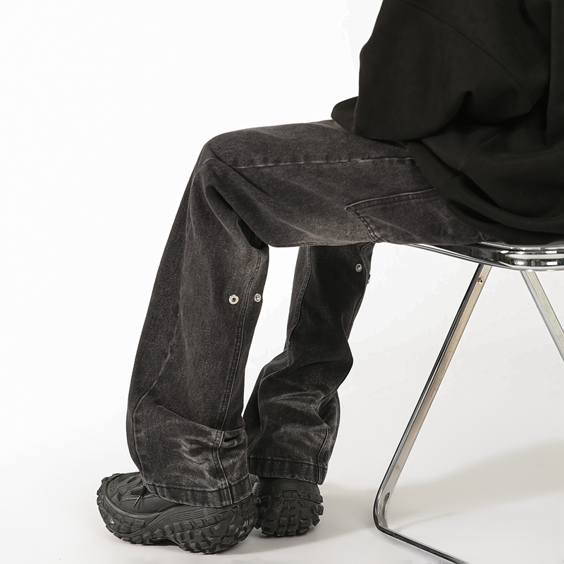高街vibe裤 显瘦直筒微喇裤 子铆钉做旧黑色牛仔裤 新款 子 男春季 美式