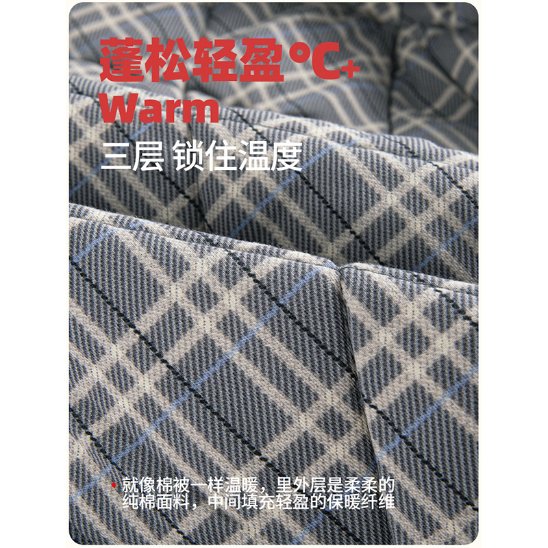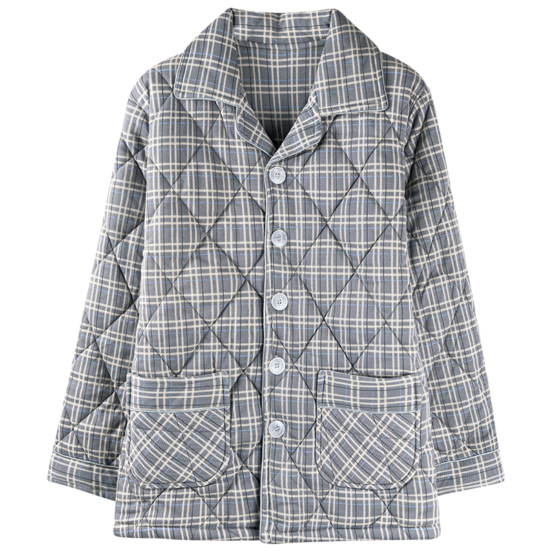 男士 睡衣三层纯棉夹棉袄单件上衣保暖加厚家居服外套格子 秋冬天款