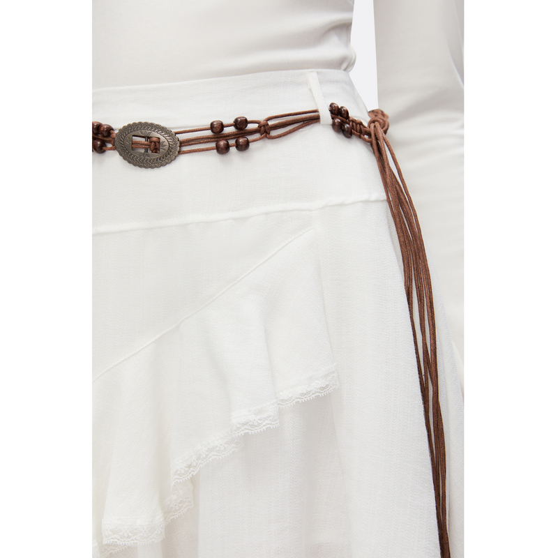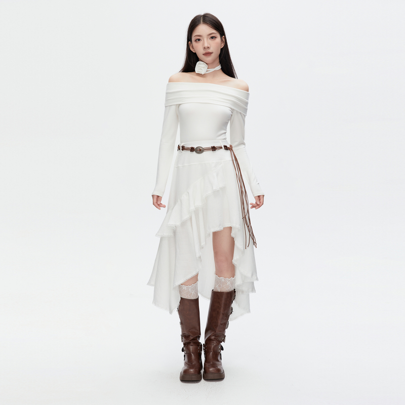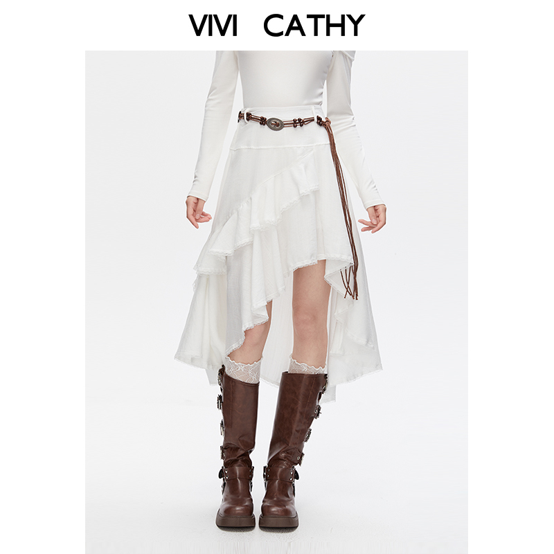 VIVICATHY2025秋高腰不规则半身裙女欧若风多层荷叶边a字长裙白