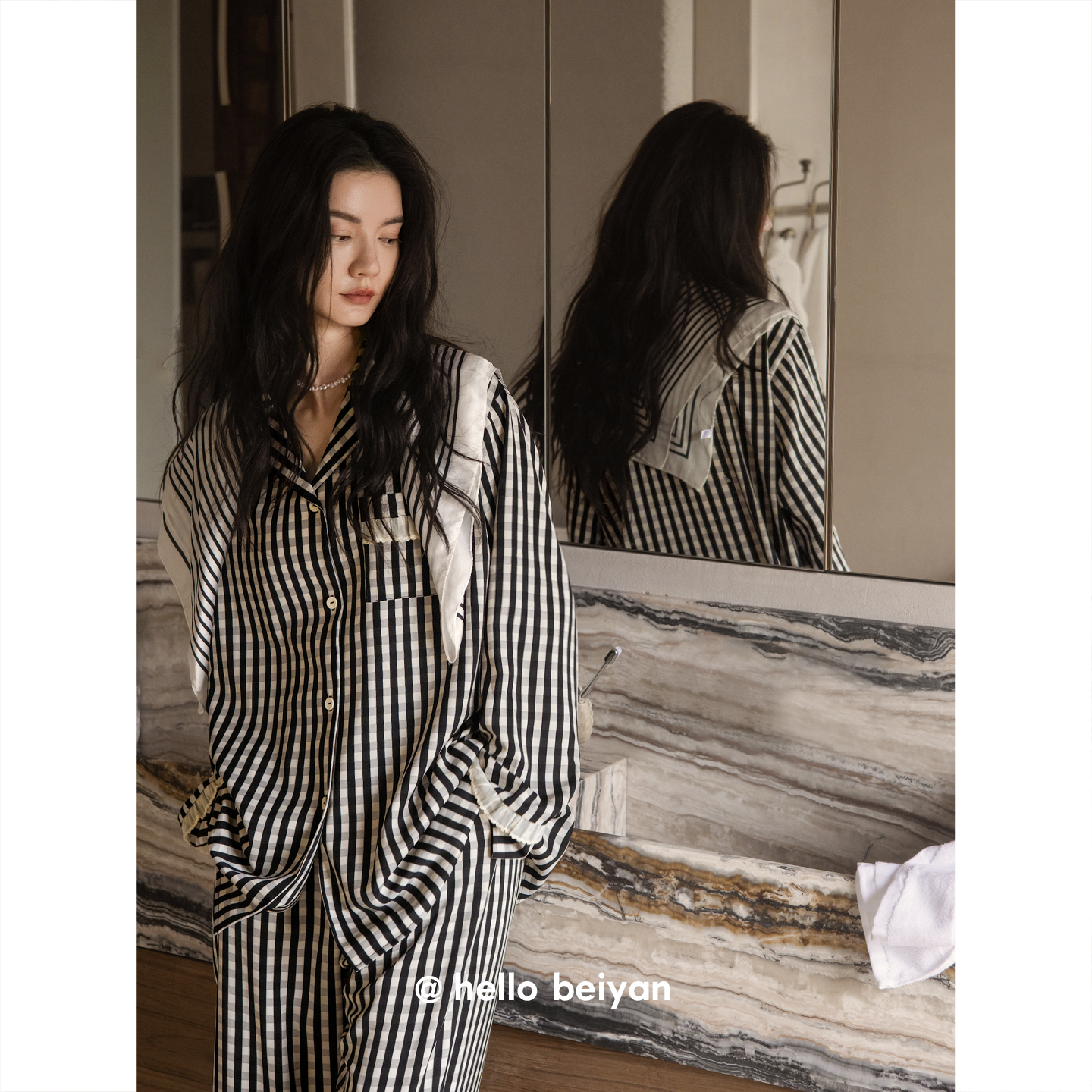 套装 贝妍舒适松弛感穿搭睡衣女款 家居服简约格子大码 长袖 春秋开衫
