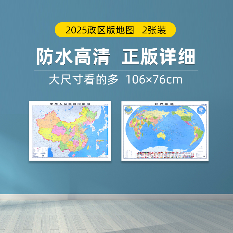 106×76cm 大尺寸高清版 学习装 中国 饰两用地图 学生地理学习必备 世界地图地质社 精准印刷清晰易懂 2025版 防水耐磨材质