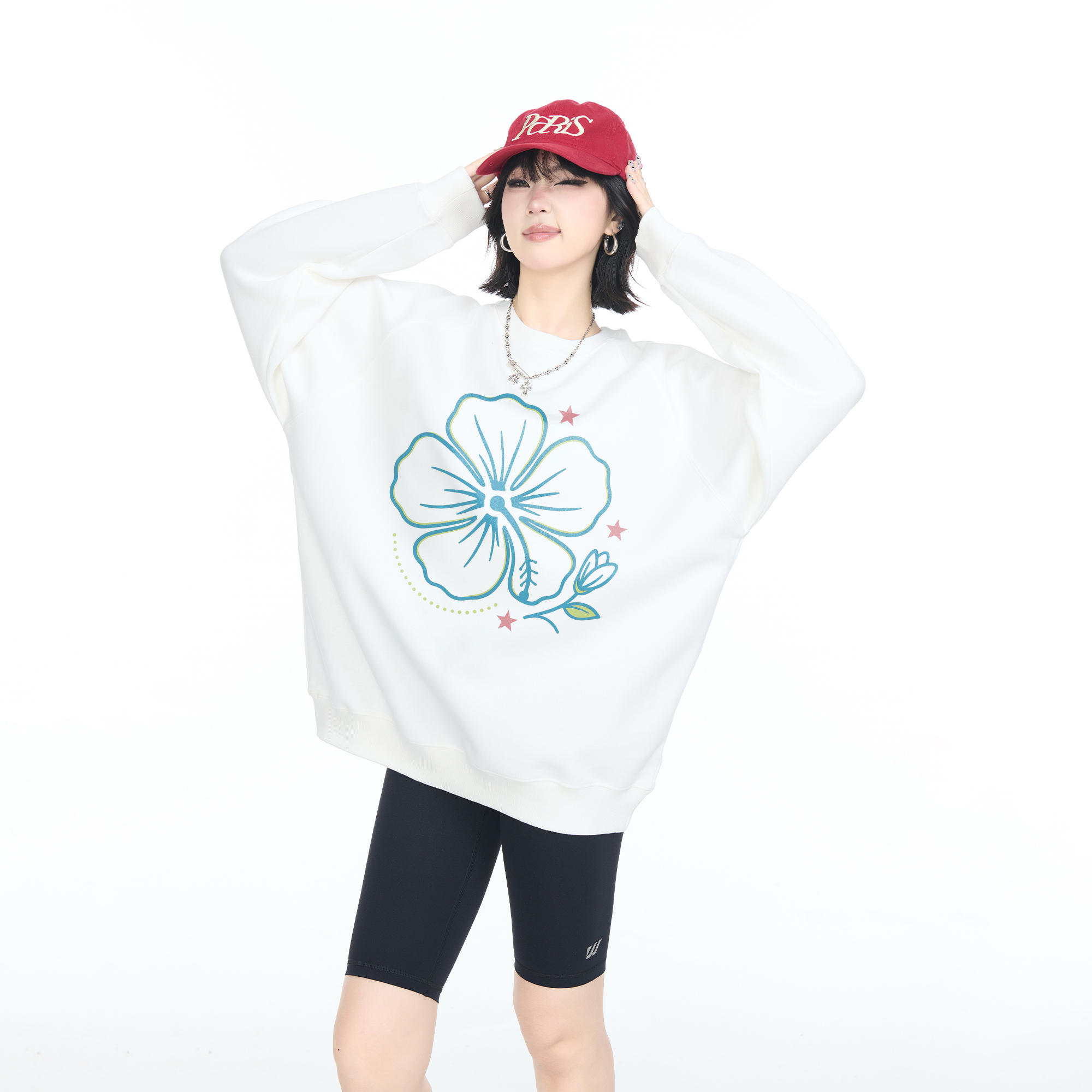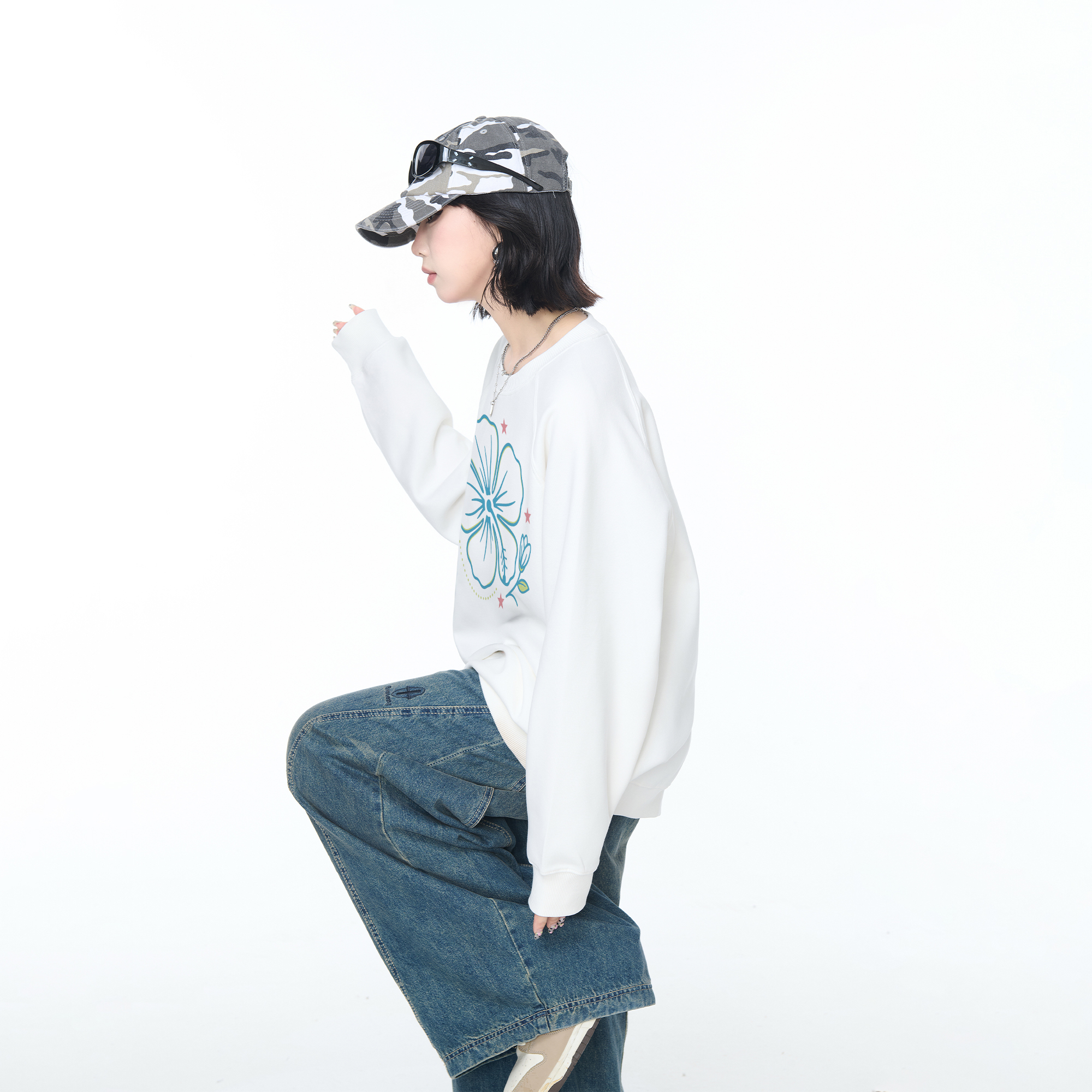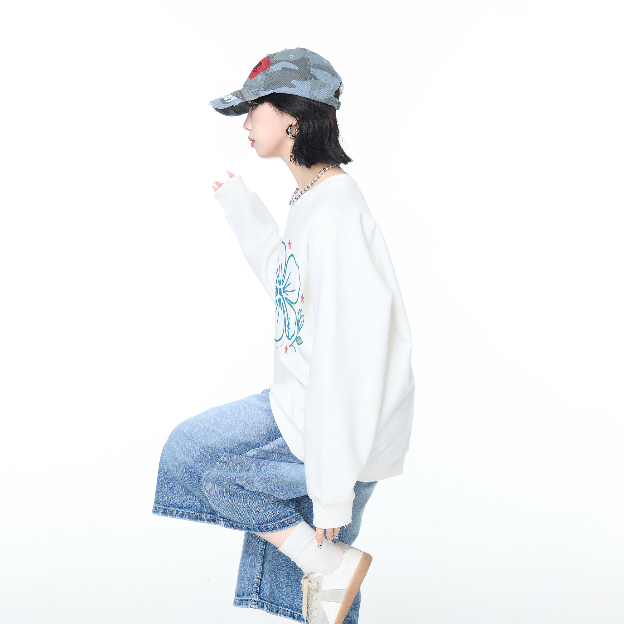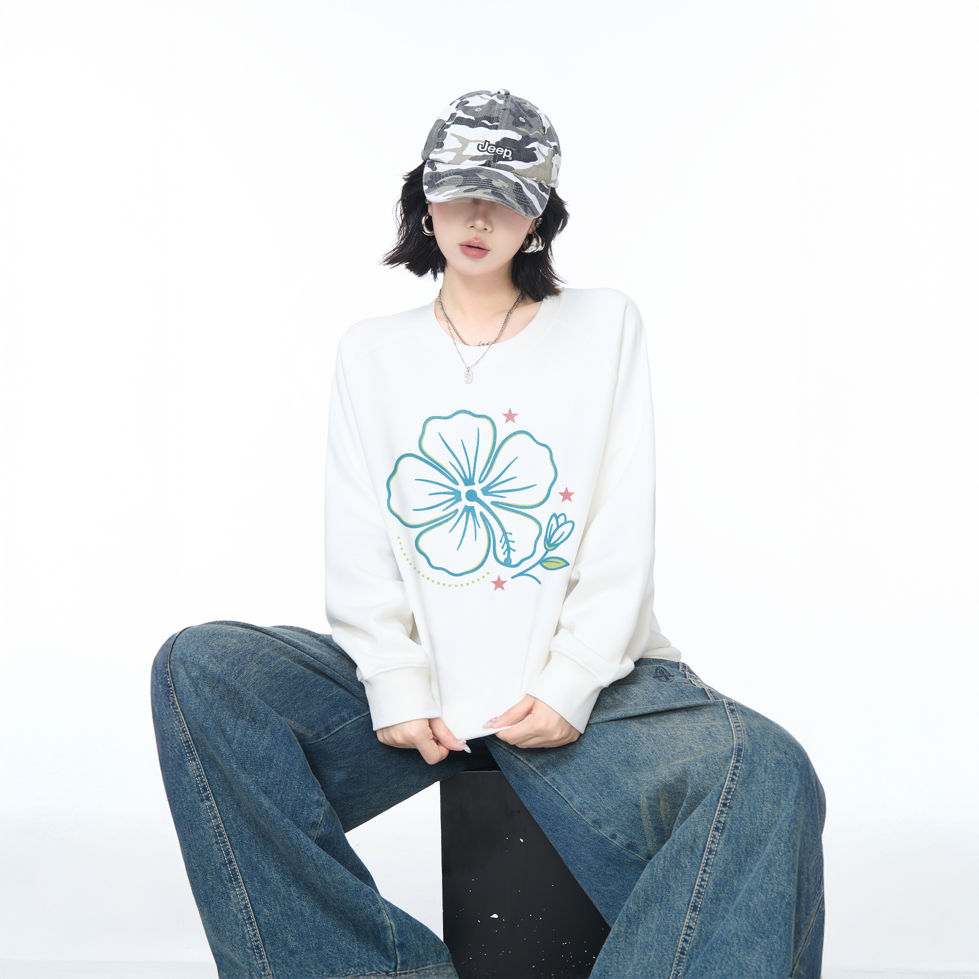 YEP春秋新款 复古风宽松休闲无帽外套上衣 花朵印花圆领卫衣女美式