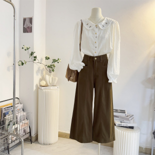 18345614 女长袖 设计师款 佐丹奴宽松miu系学院风花边立领格纹衬衫
