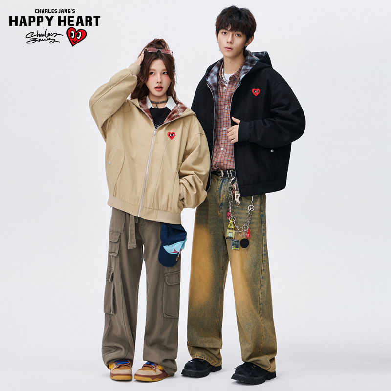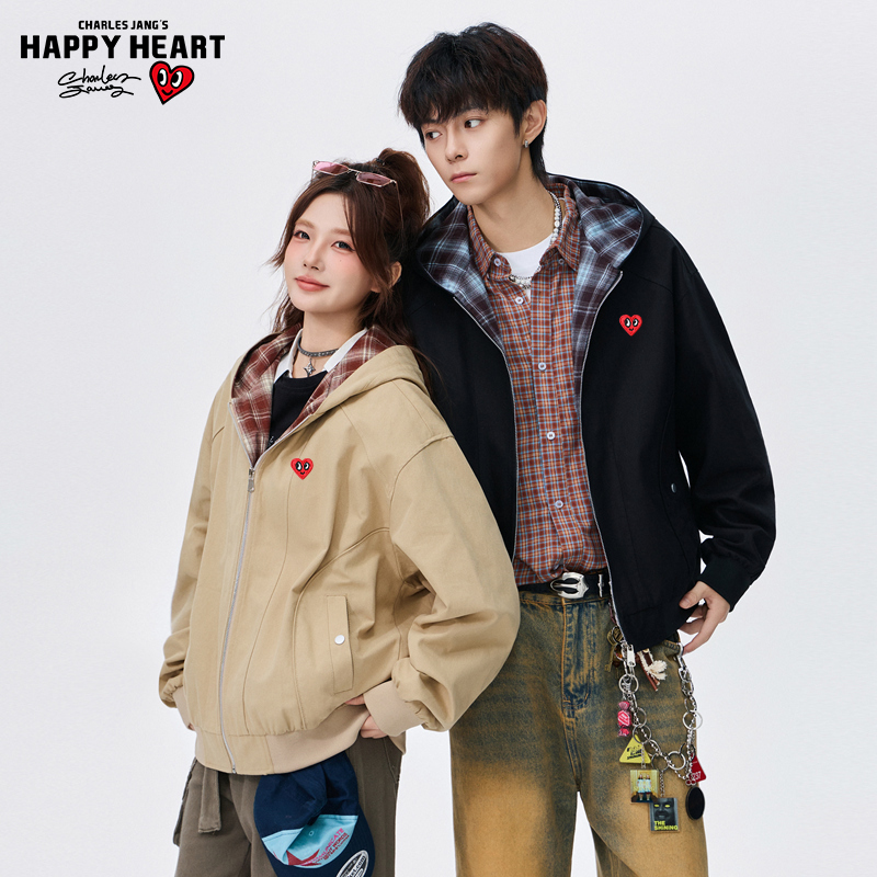 情侣连帽外套 宽松百搭休闲美式 查尔斯桃心 格子夹克男女春秋季