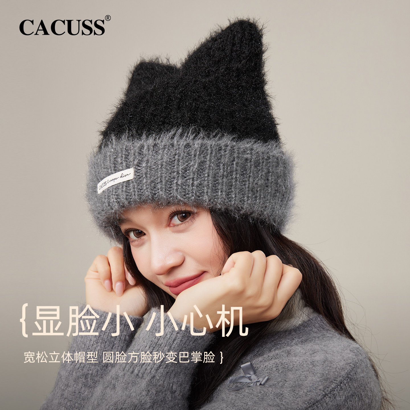 CACUSS猫耳朵帽子女秋冬可爱毛线帽大头围保暖护耳防寒毛绒针织帽