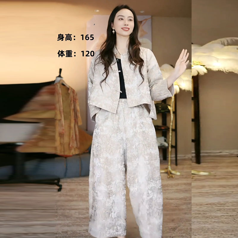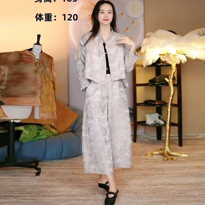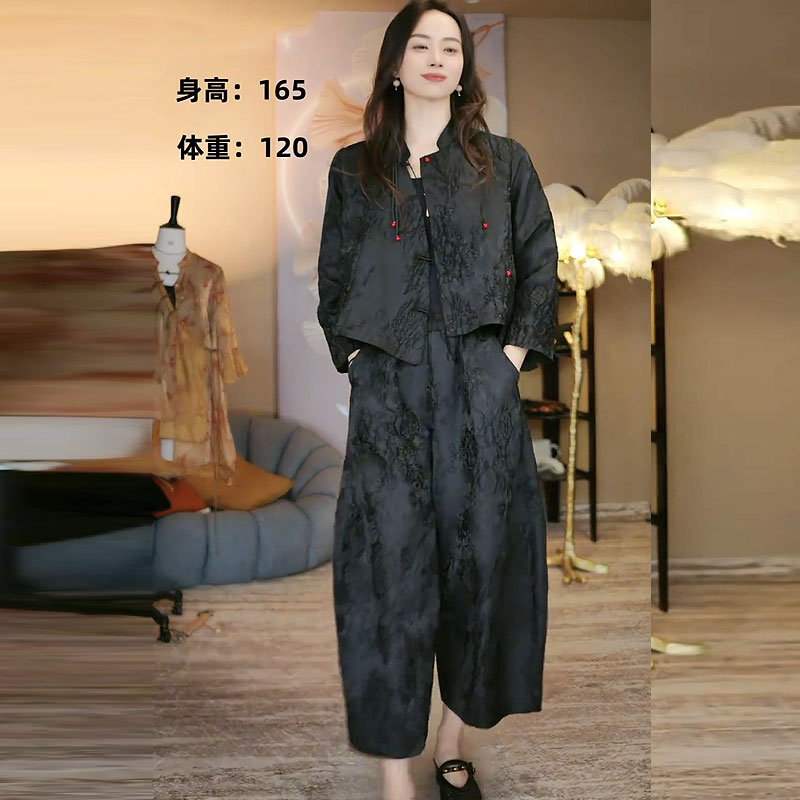 时尚 压花休闲裤 国风套装 立领盘扣短外套 两件套 女2025秋新款 大码