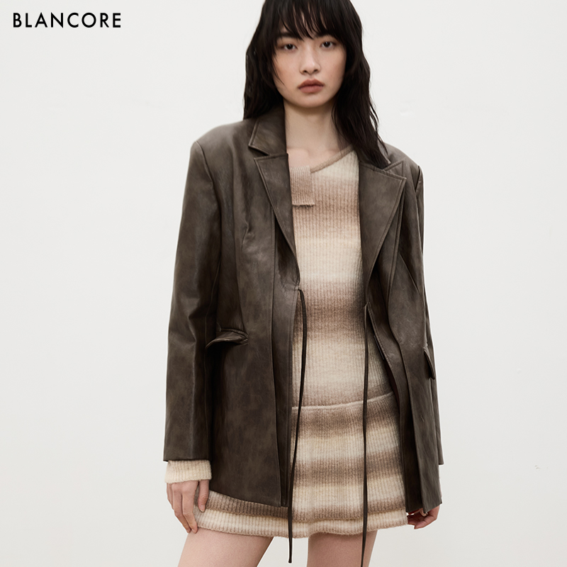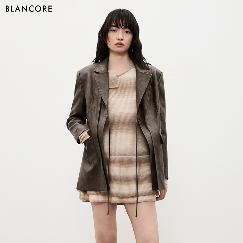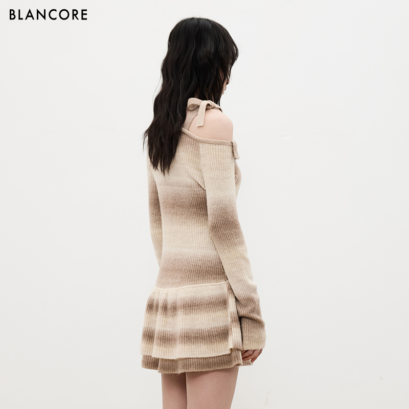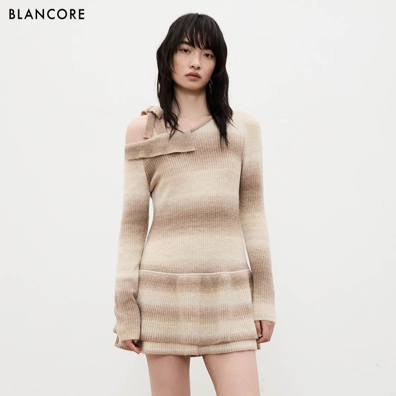 设计师品牌BLANCORE 长袖 2025秋季 斜肩渐变毛织短款 连衣裙 新品