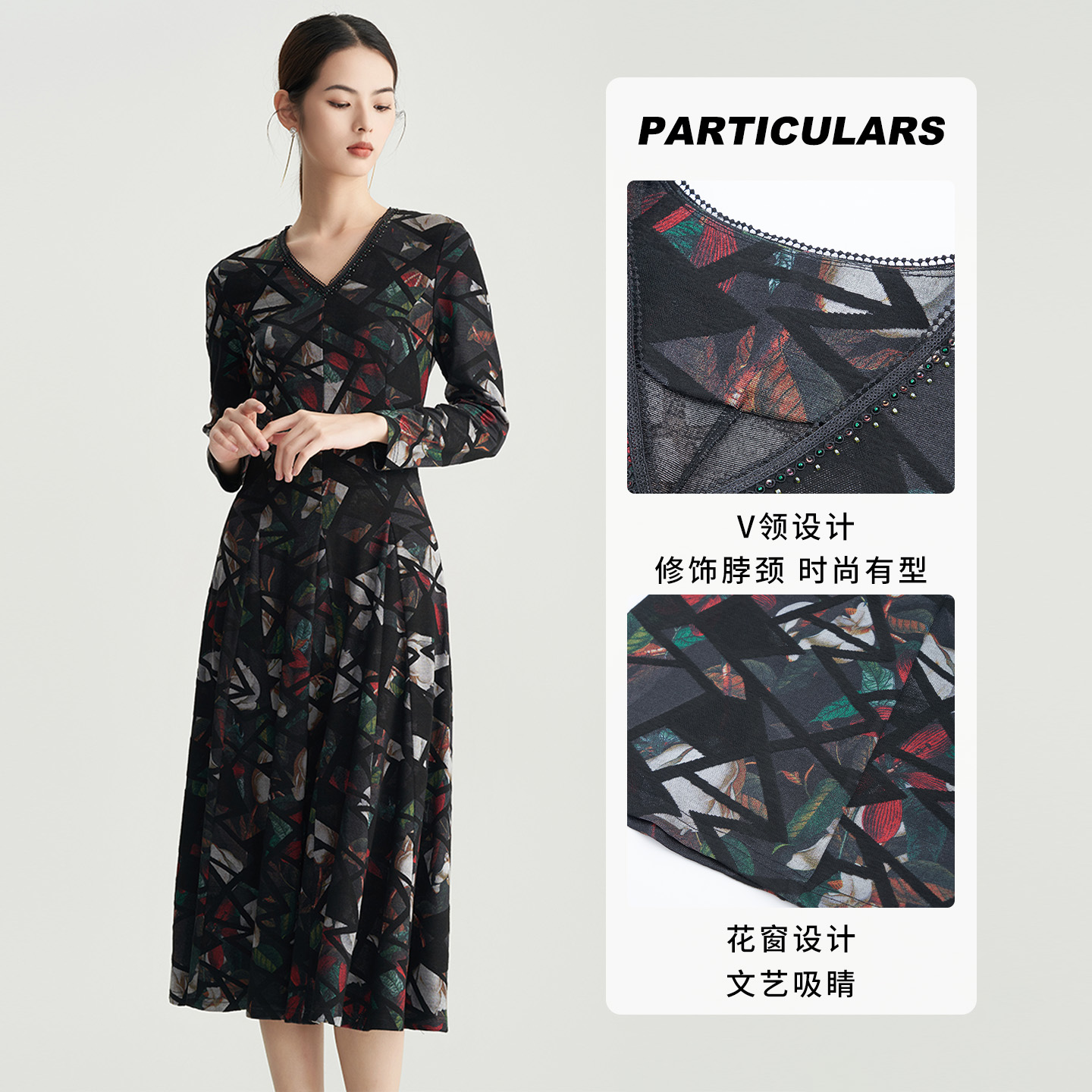 女 气质时尚 马天奴2025秋冬新款 黑色印花V领花边连衣裙子收腰长袖