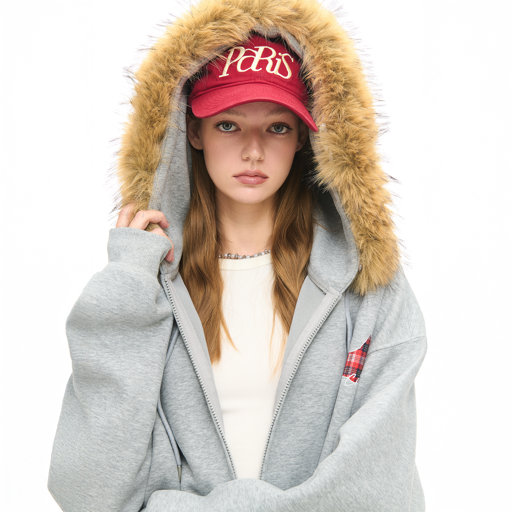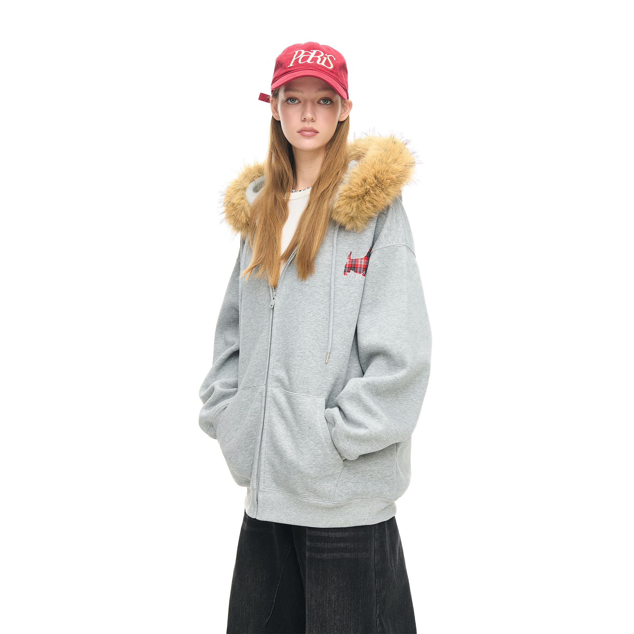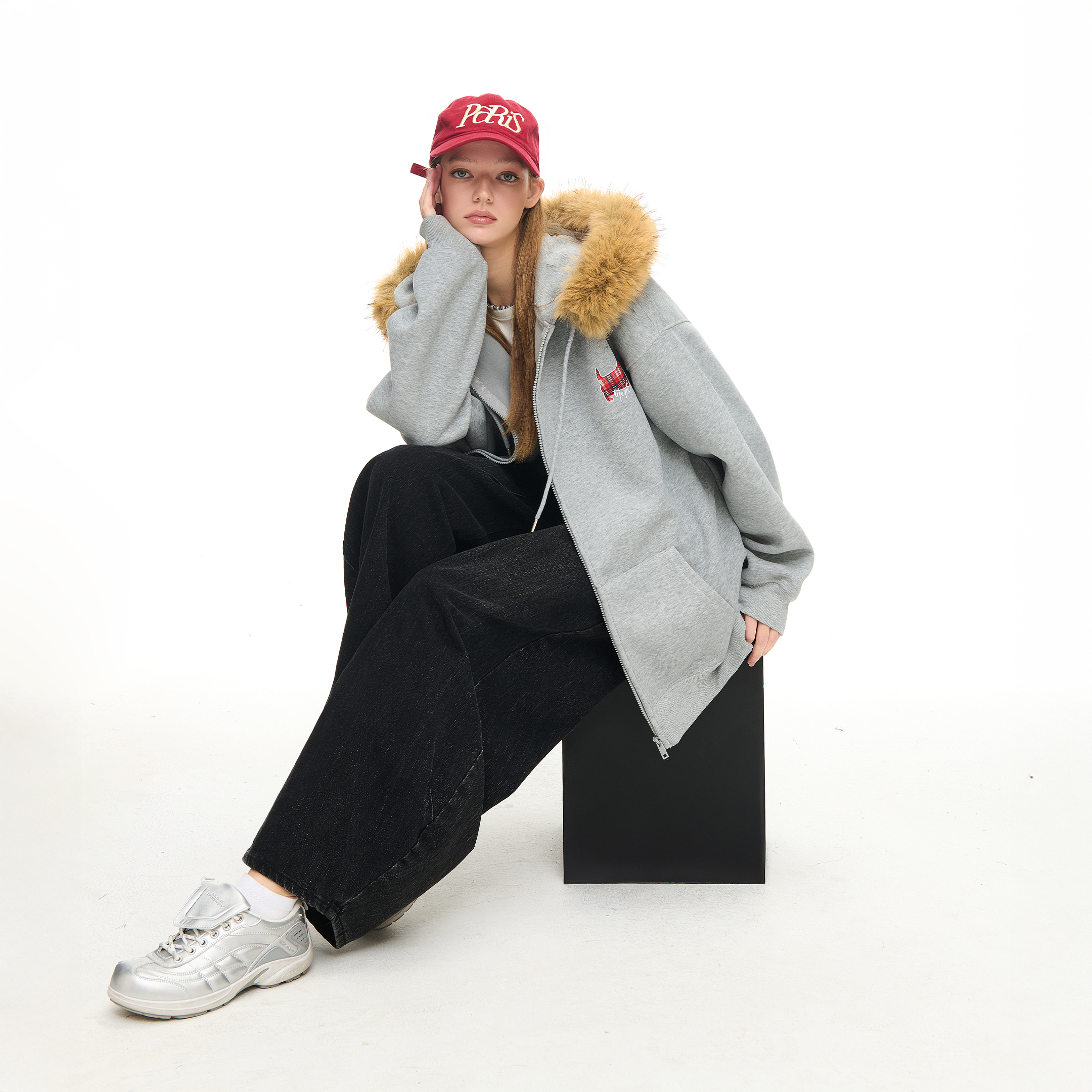 宽松情侣款 美式 新款 卫衣女秋季 外套 复古创意印花连帽毛领拉链开衫