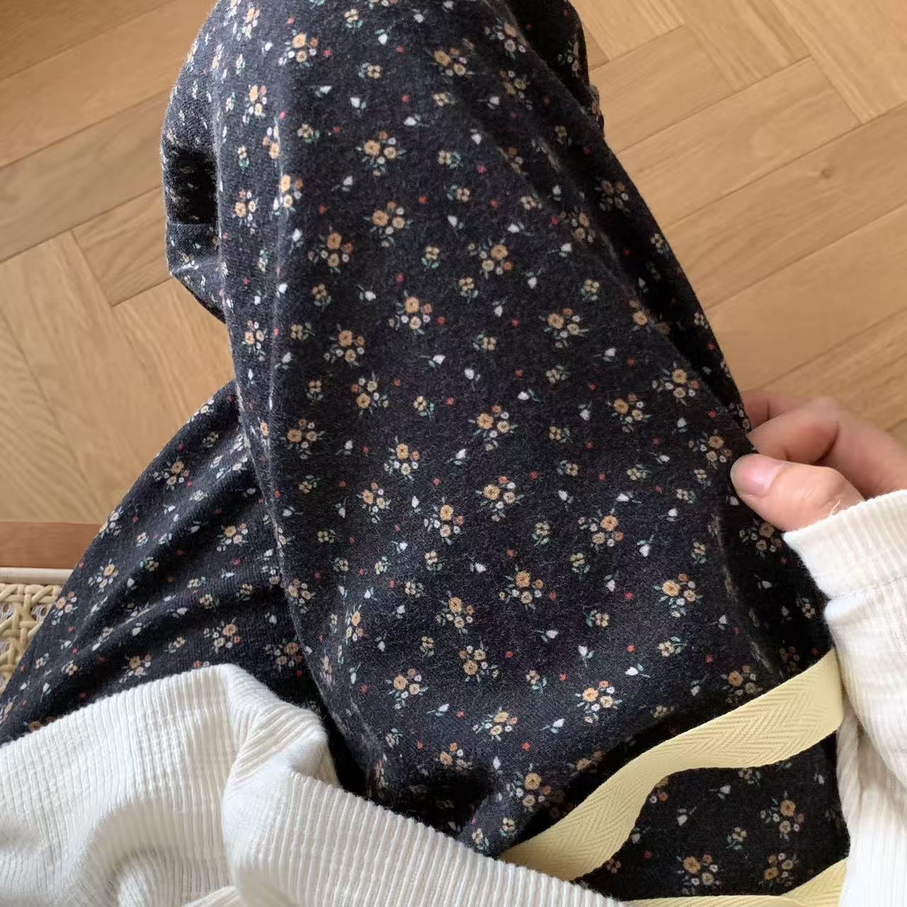 可外出 黑底小黄花宽松柔软舒适家居裤 秋冬季 全棉磨毛抽绳长裤