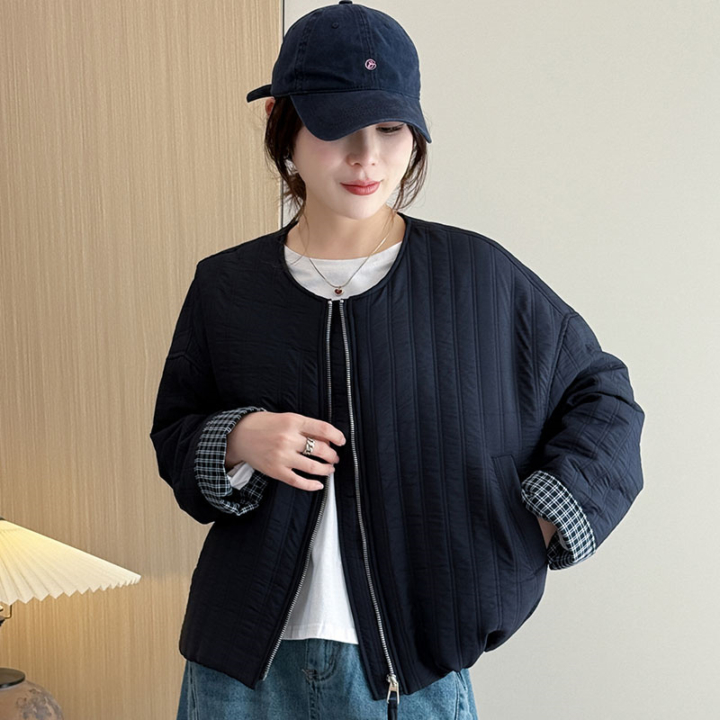 圆领压棉短外套女秋冬格子拼接设计百搭宽松上衣 时尚 网红爆款 韩版