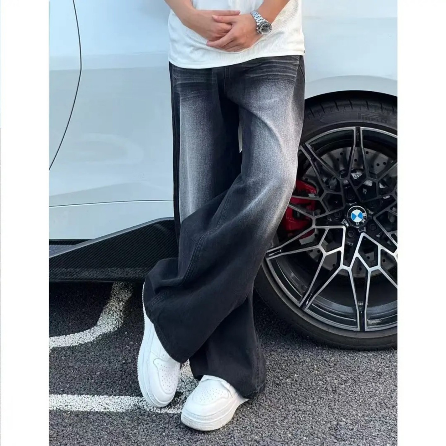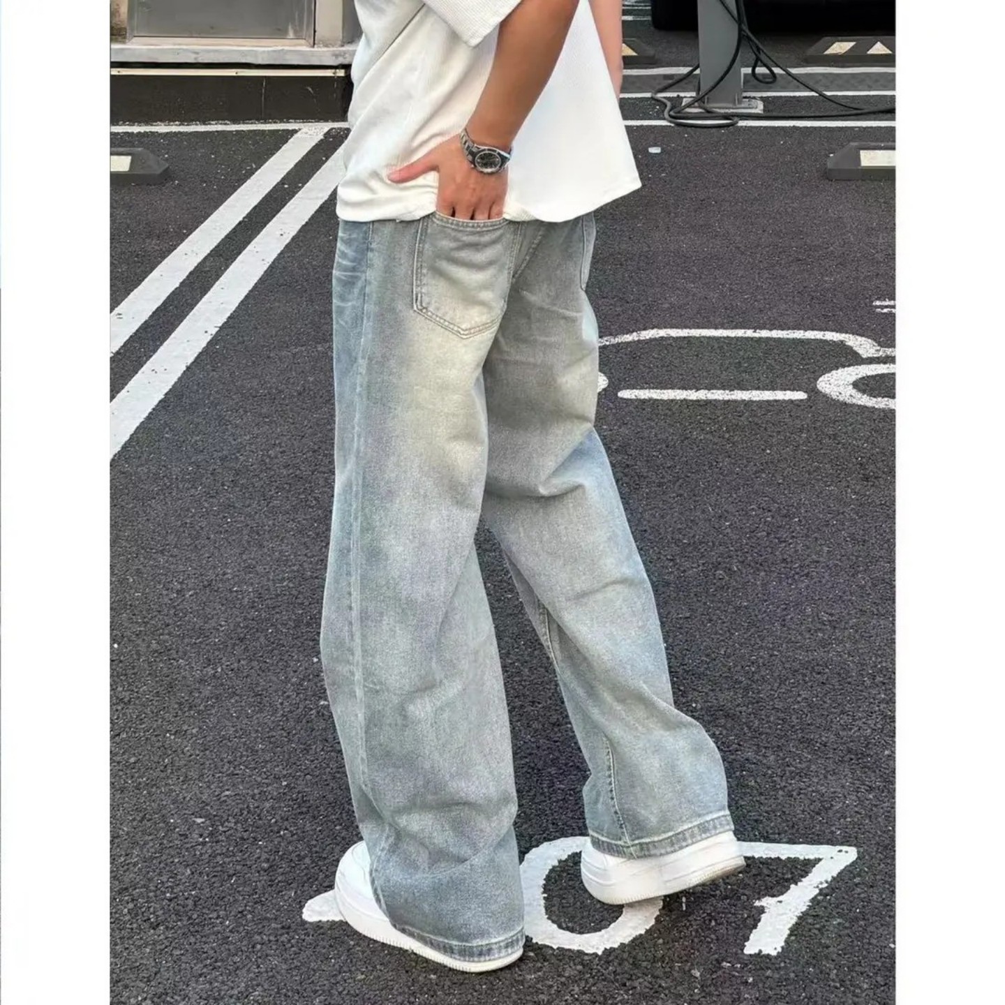 高街解构阔腿裤 V37美式 潮牌宽松直筒裤 男秋季 复古褶皱弯刀牛仔裤