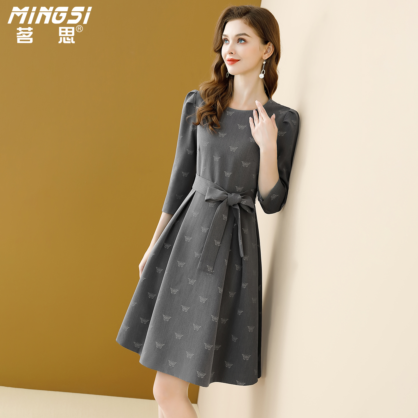 七分袖 新款 系带收腰显瘦大摆裙 气质印花连衣裙女2025秋季 茗思法式