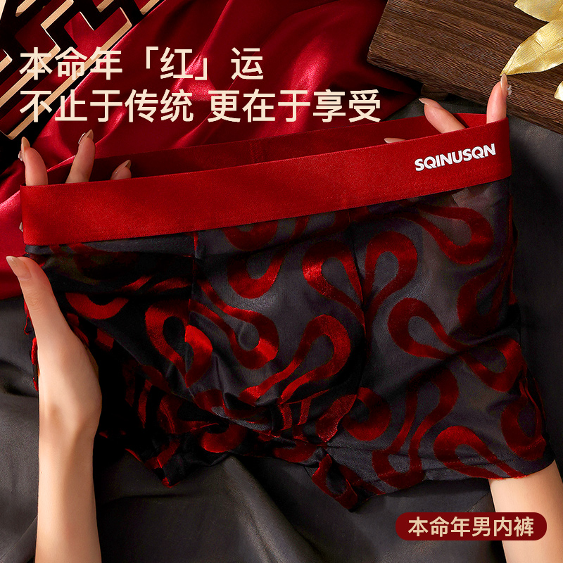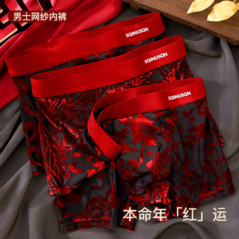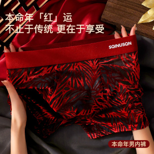 衩7A抑菌亲肤舒适 轻奢性感烧花本命年结婚喜庆红色四角裤 男士 内裤