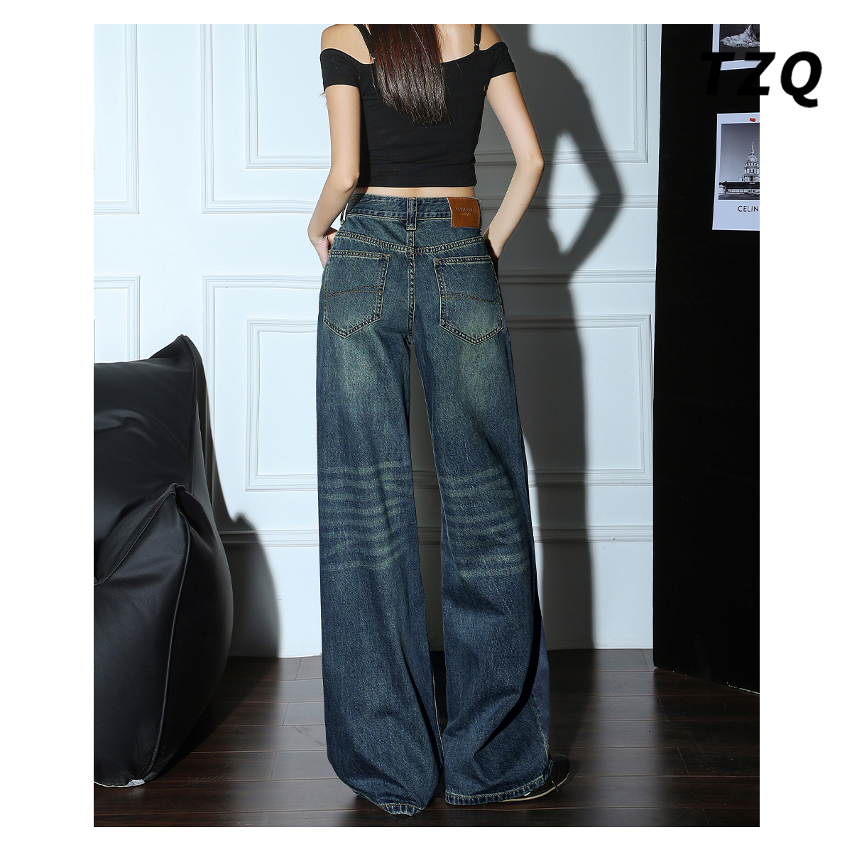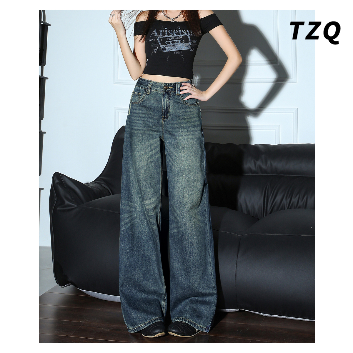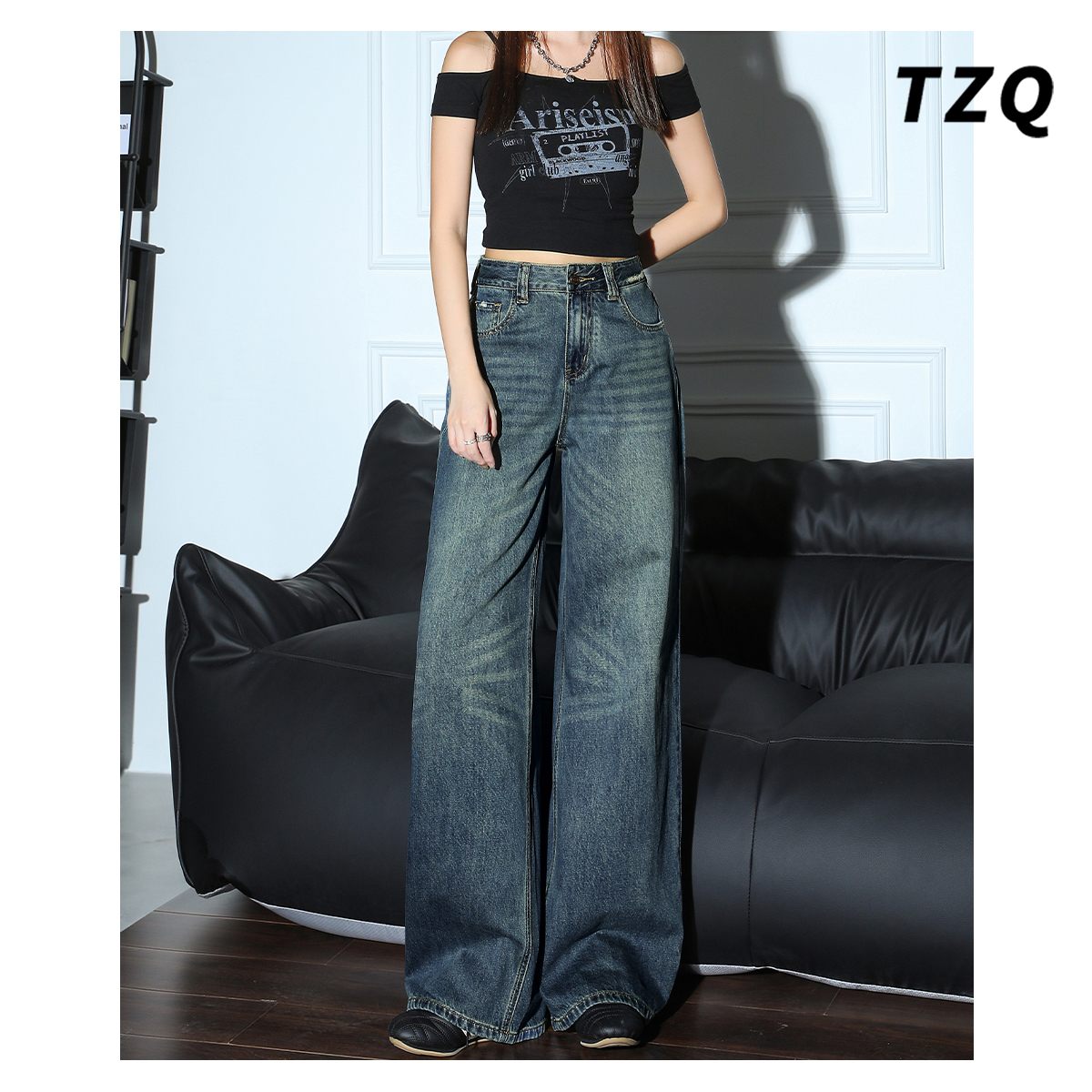 复古高街垂感拖地直筒裤 美式 子 女2025爆款 重工洗水花纹阔腿牛仔裤