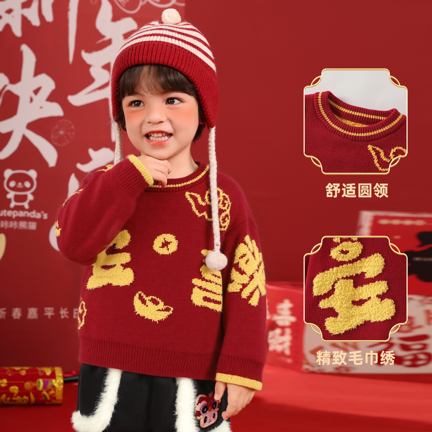 咔咔熊猫宝宝恭喜发财毛衣冬装 秋冬男童新年拜年服 儿童加厚针织衫