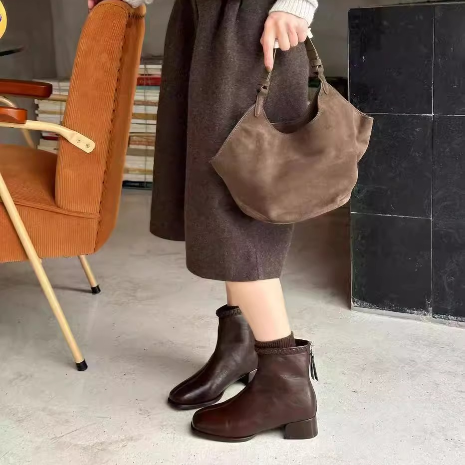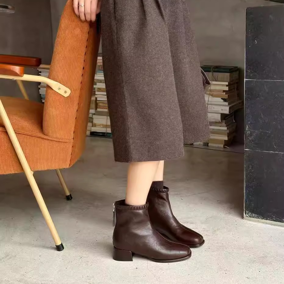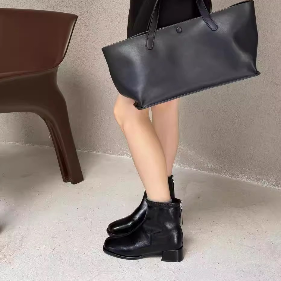 显瘦方头粗跟厚底短靴女2025秋冬新款 气质简约舒适后拉链瘦瘦靴