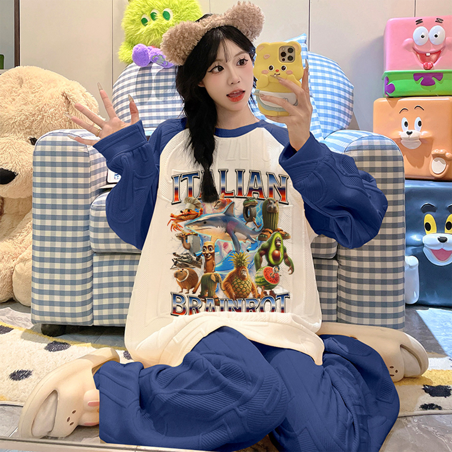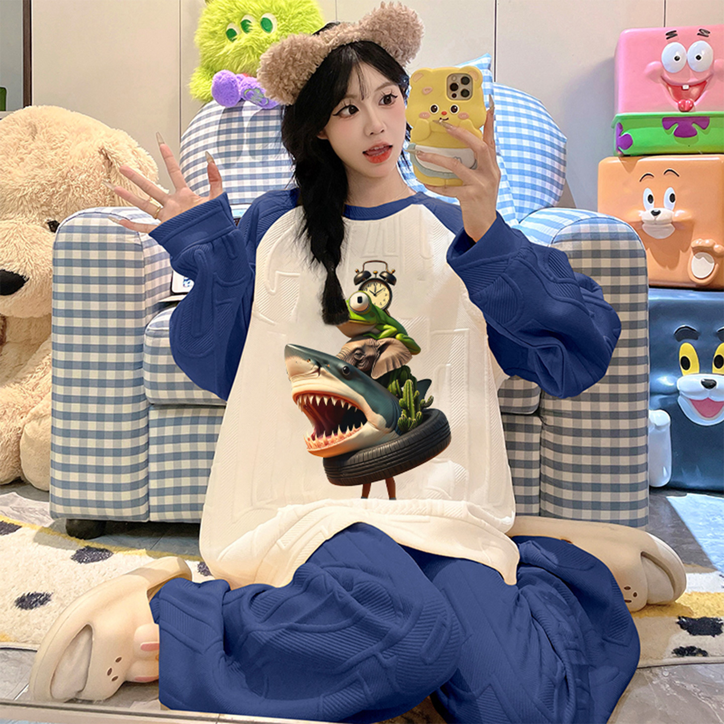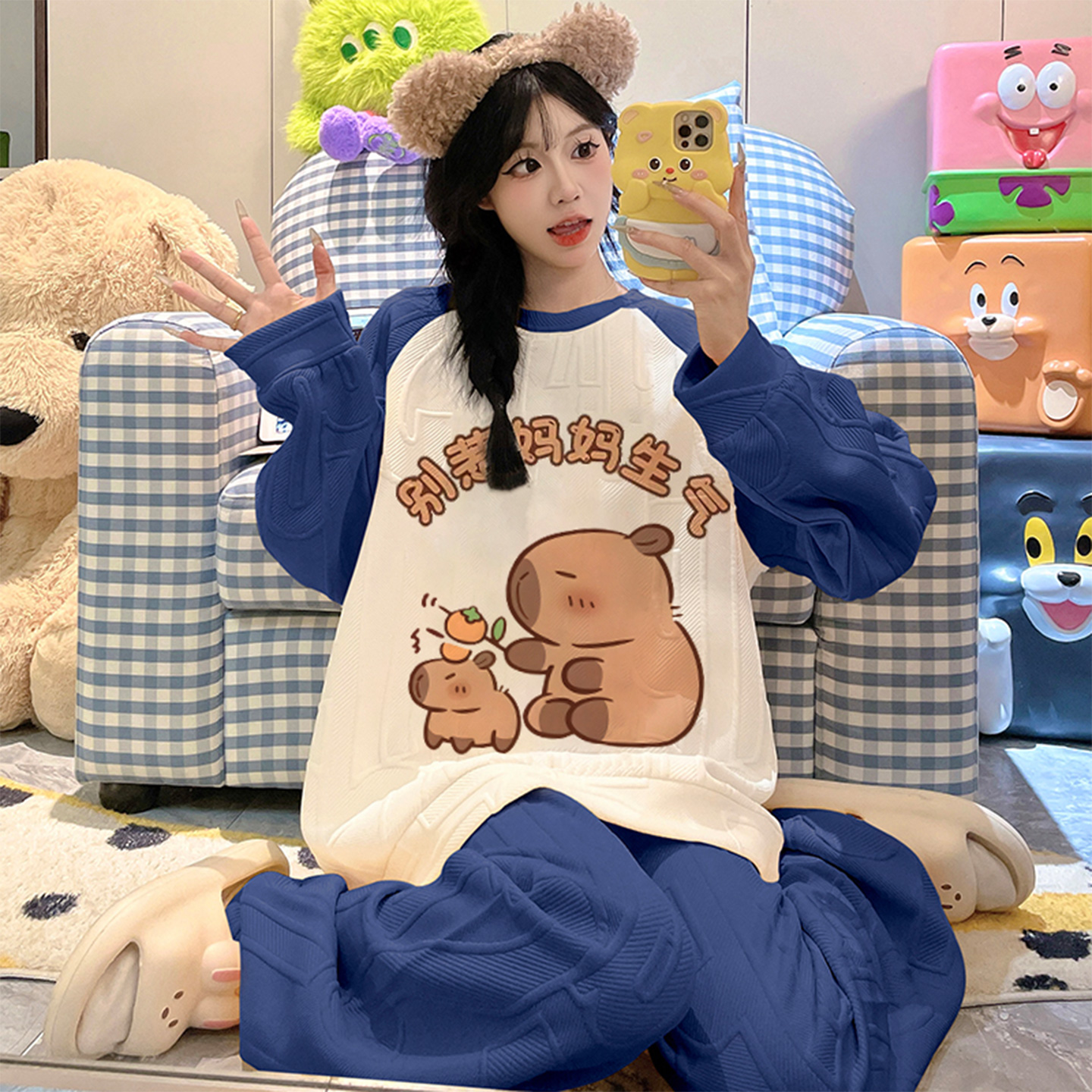 纯棉带胸垫可爱卡通套装 春秋季 女生薄家居服夏 长袖 卡之恋睡衣女款