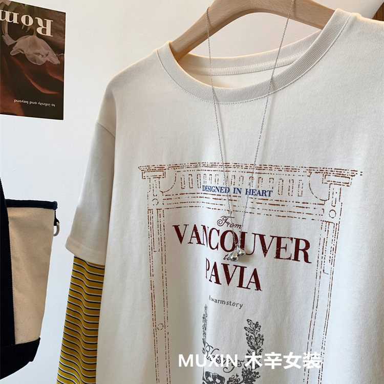 女显瘦上衣 T恤衫 胖妹妹大码 200斤复古图案印花假两件条纹插肩长袖