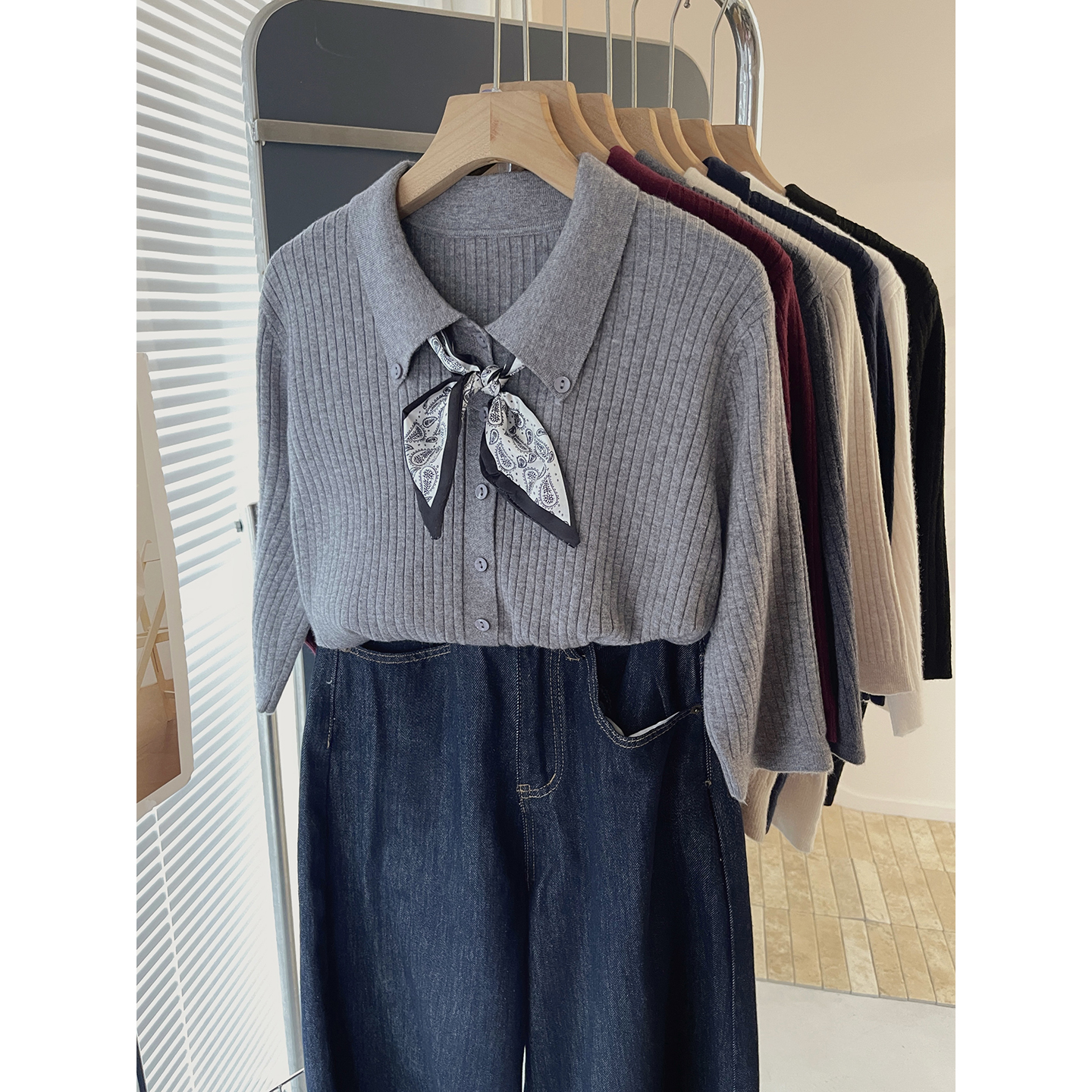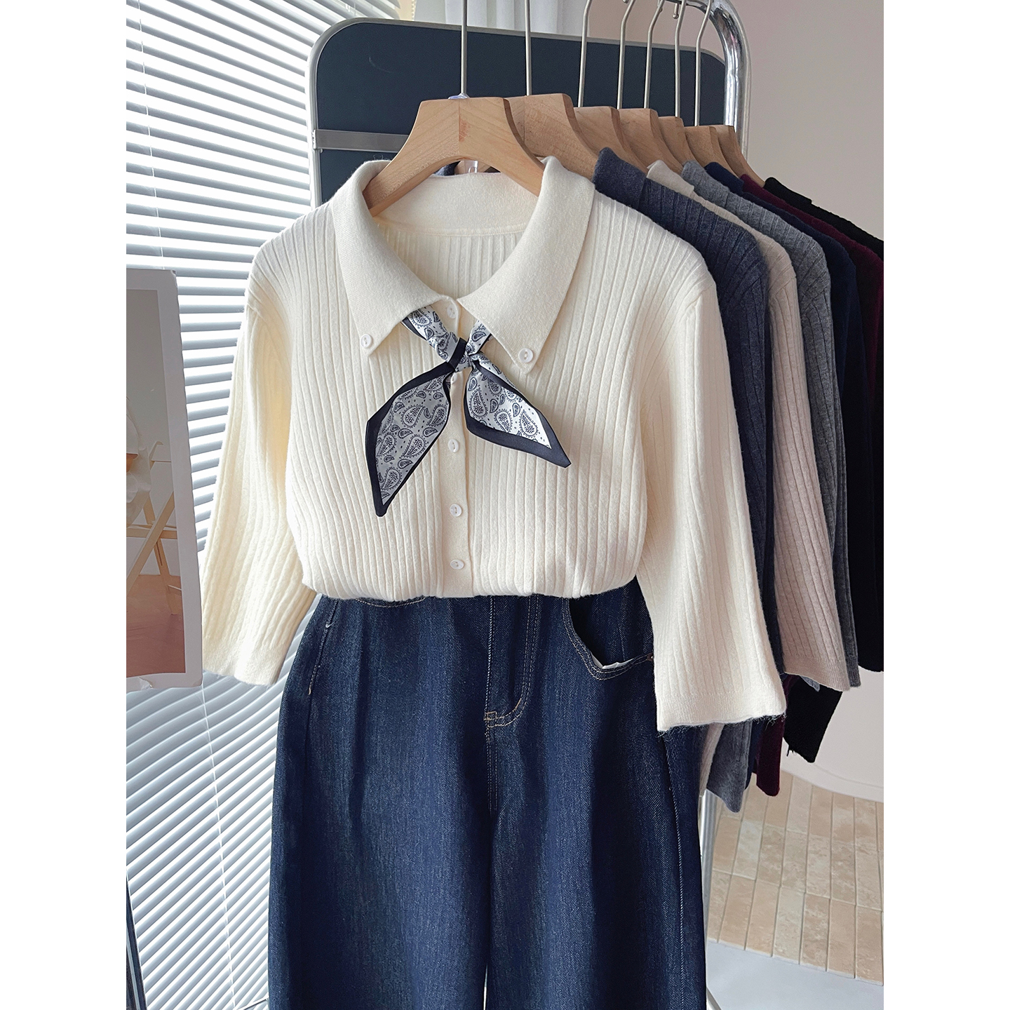 上衣纯色气质款 翻领针织衫 中袖 新款 女百搭套头配丝巾2025秋季