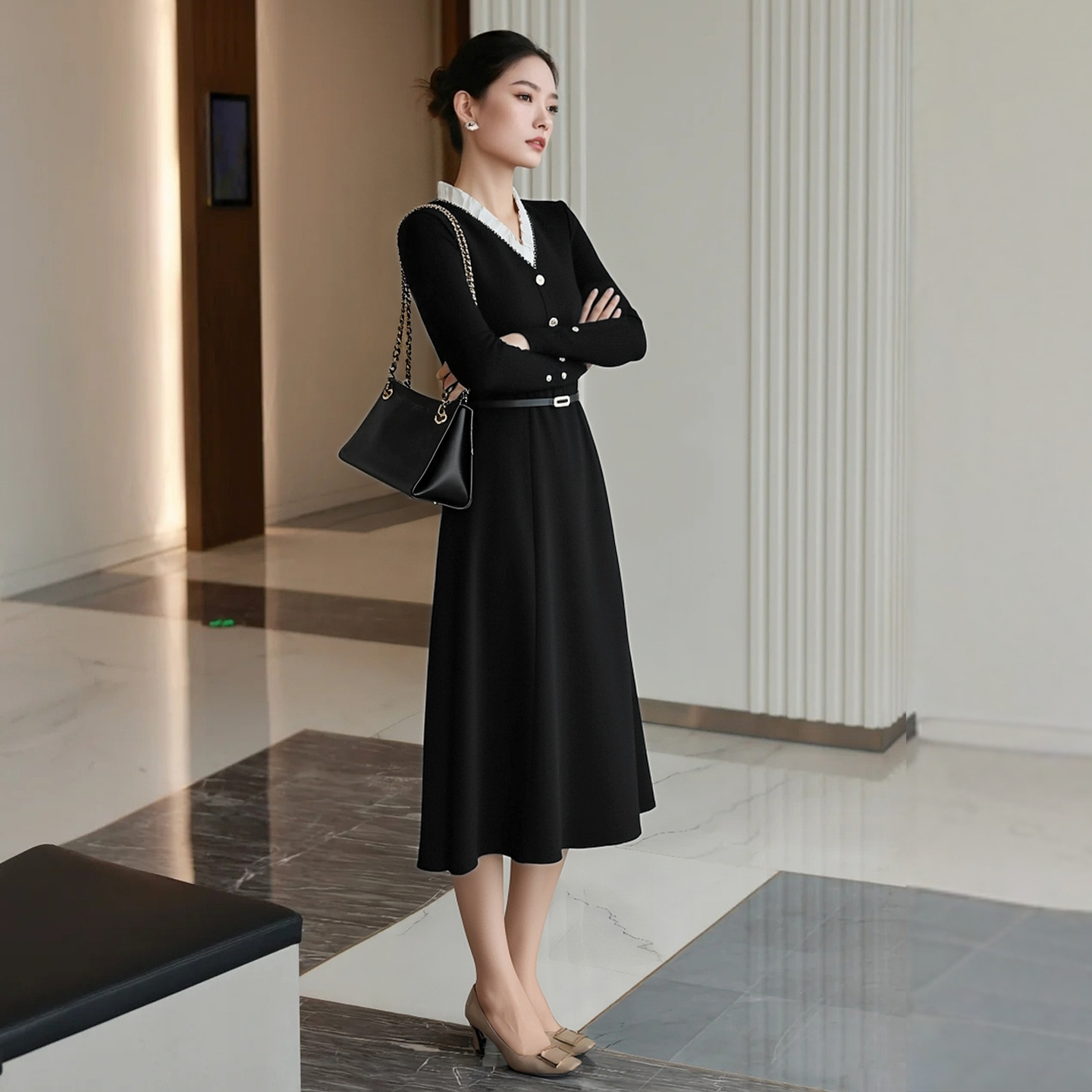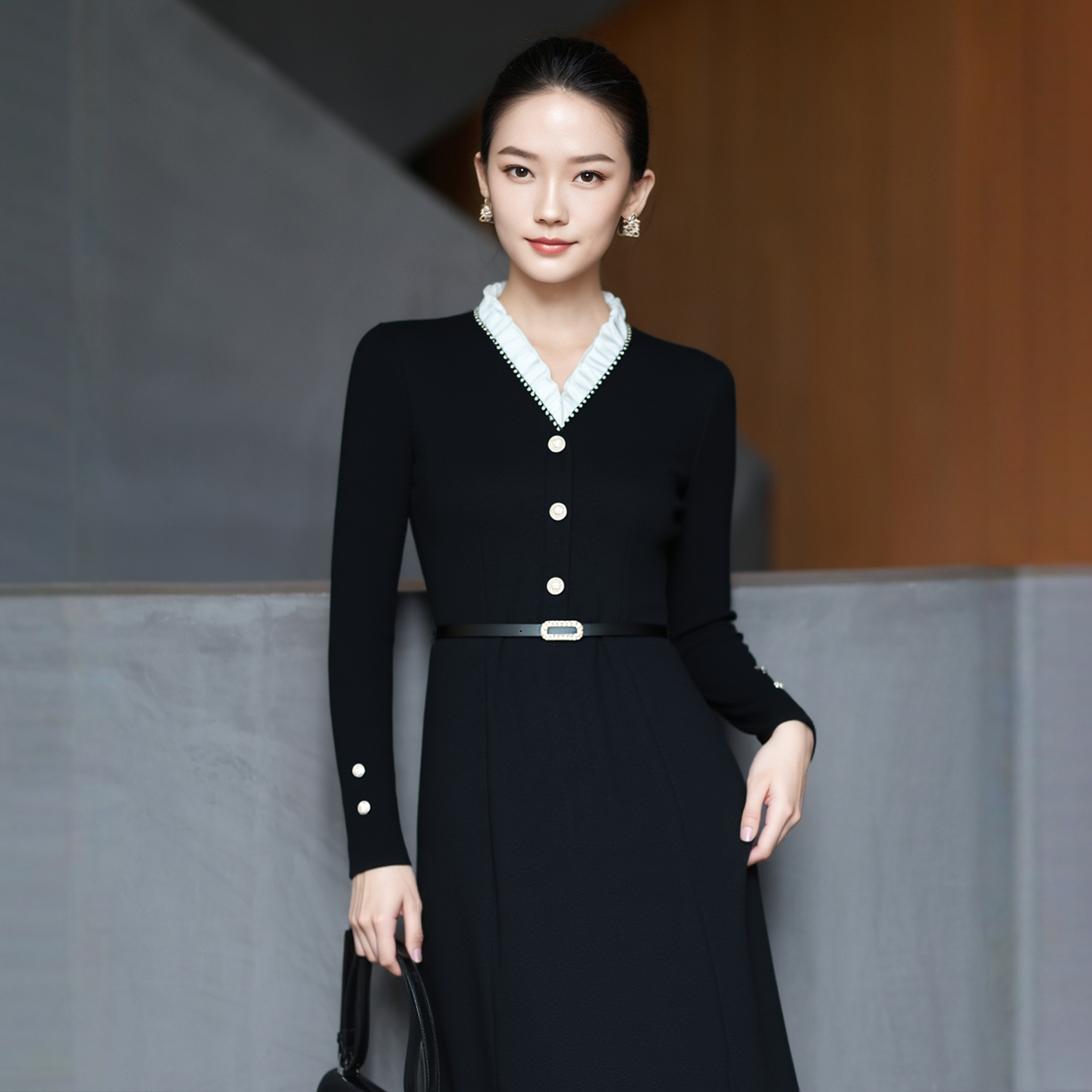 V领显胸连衣裙 新款 2025气质性感时尚 百搭收腰显瘦包臀短裙女秋季