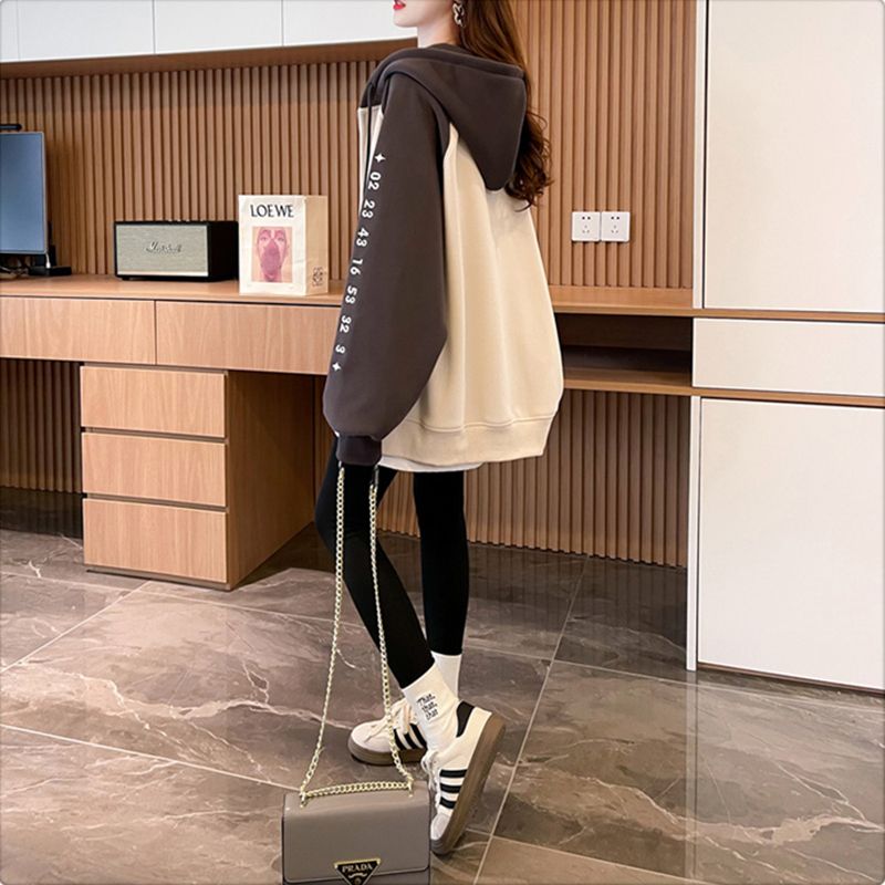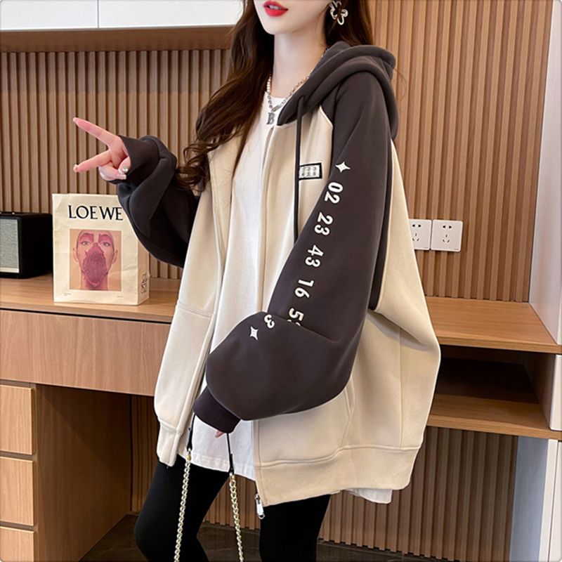 胖mm开衫 宽松大码 外套上衣 卫衣女春秋新款 拼色连帽设计感拉链薄款