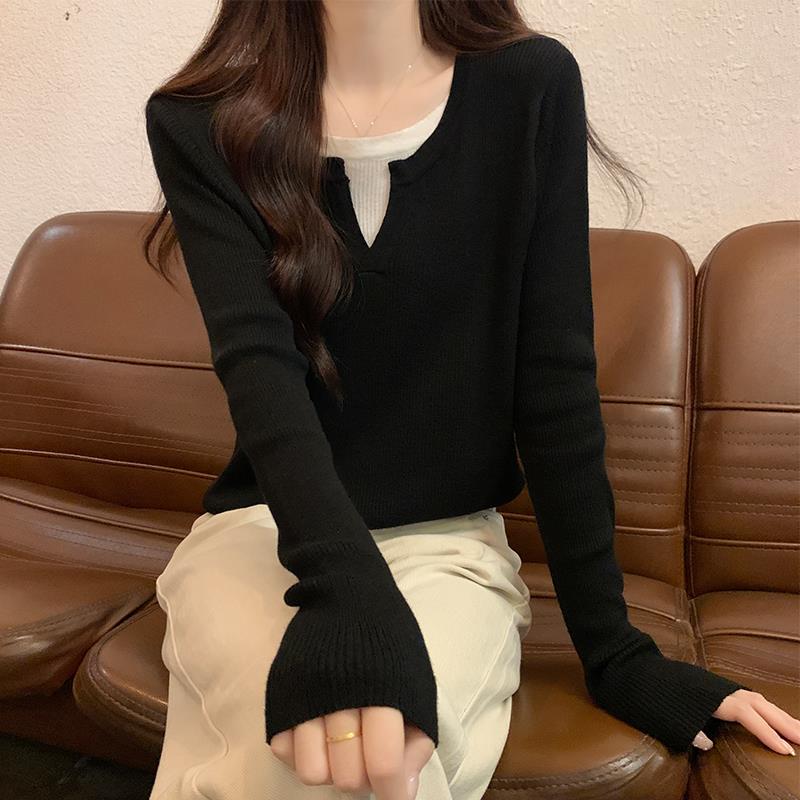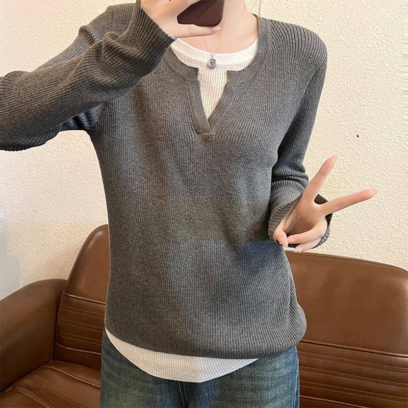 蓝色假两件长袖 显瘦减龄慵懒风针织上1018e T恤女秋宽松内搭打底衫