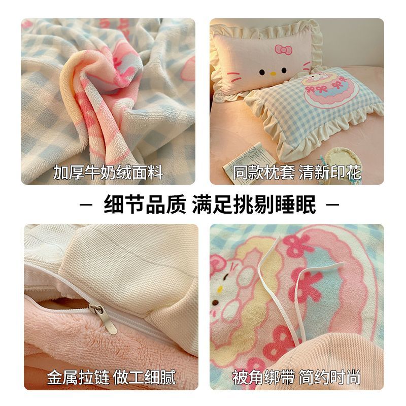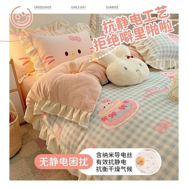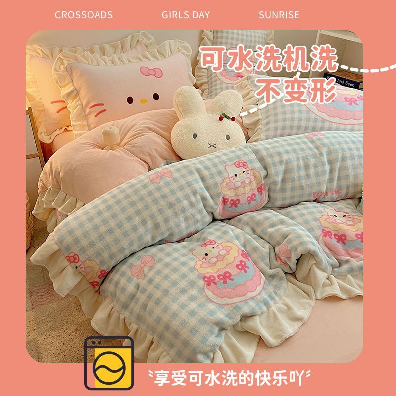 ABS冬季 牛奶绒花边床品四件套加厚珊瑚绒被套床单罩加绒单人3件套