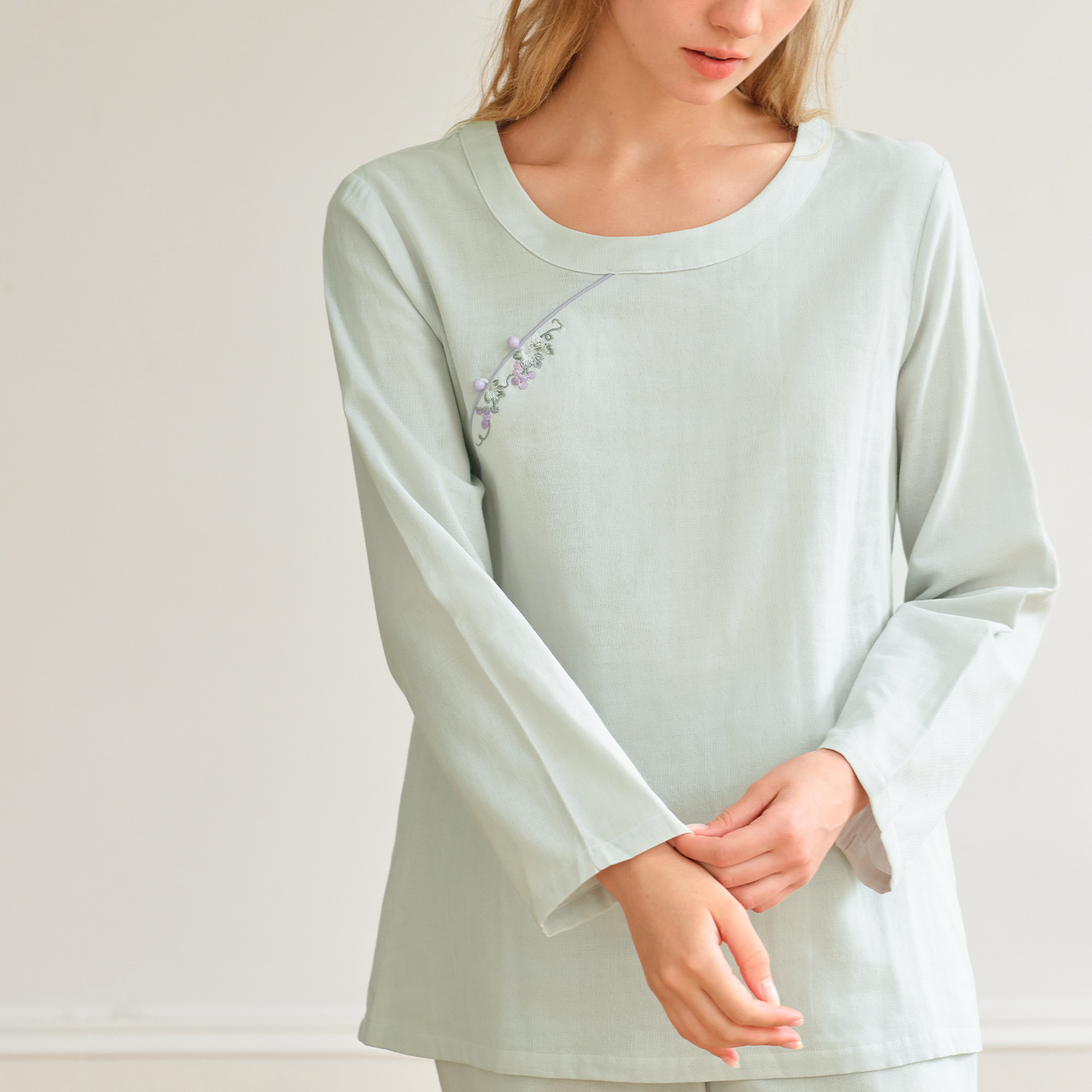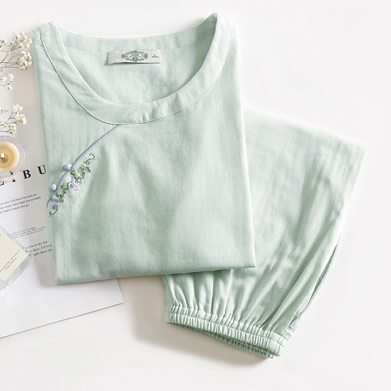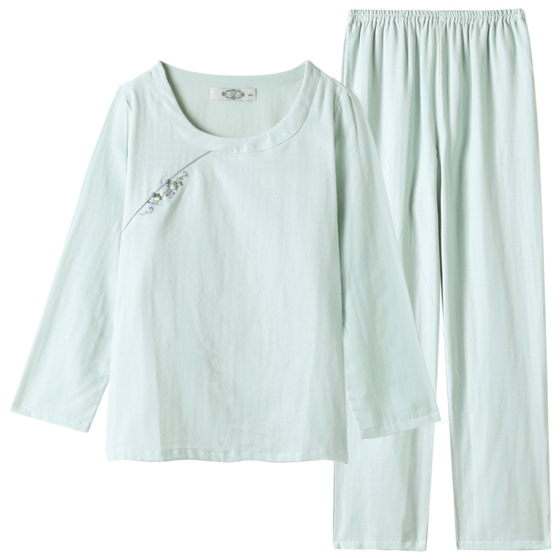 纯棉睡衣女双层棉纱复古刺绣全棉休闲家居服套装 美标秋冬新款 长袖