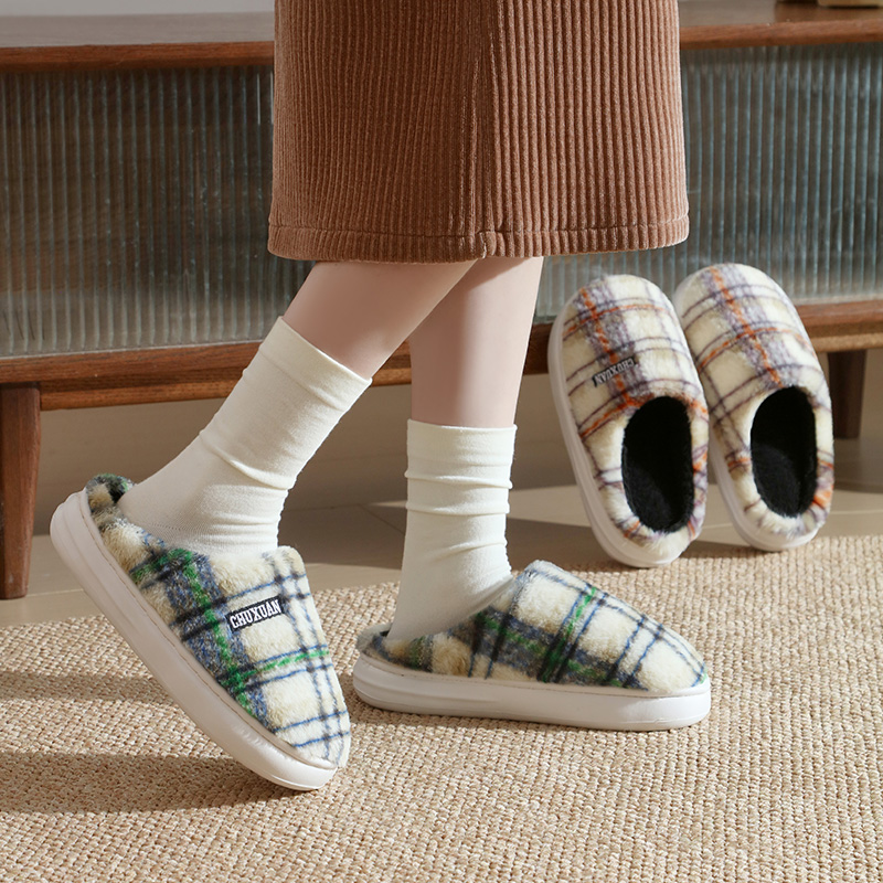冬季 初轩 复古格纹保暖家居室内情侣家用毛绒棉拖鞋 EVA厚底