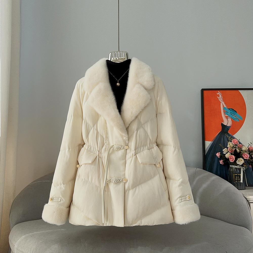 领修身 大衣西装 外套厚 水貂毛拼接90白鹅羽绒服女中长款 2025新中式