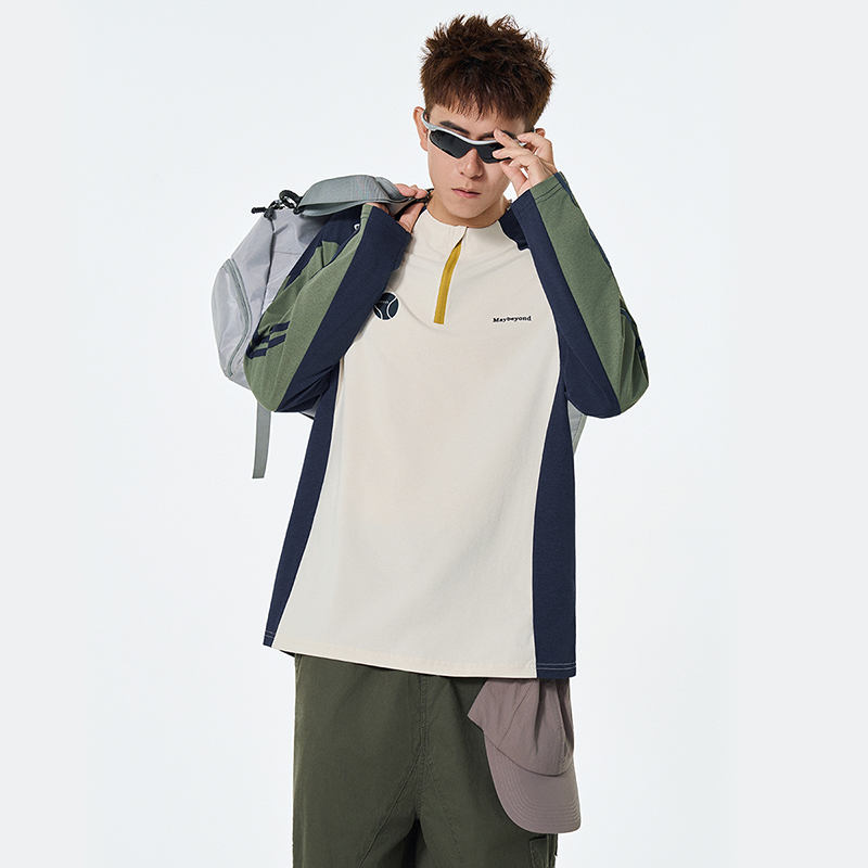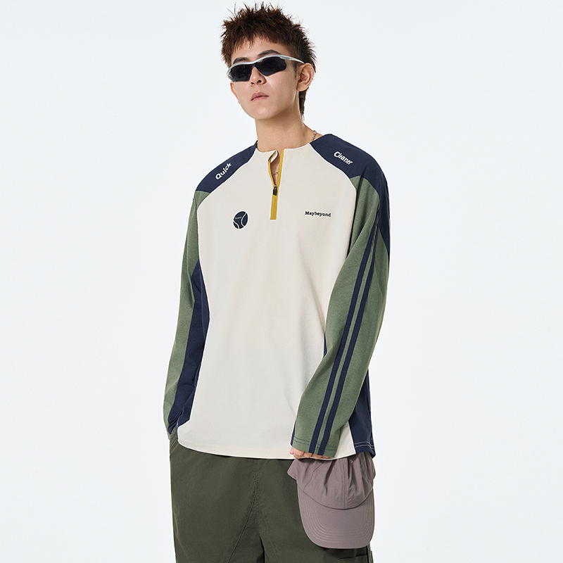 重磅宽松休闲情侣打底衫 美式 T恤男款 潮牌设计感拉链纯色长袖