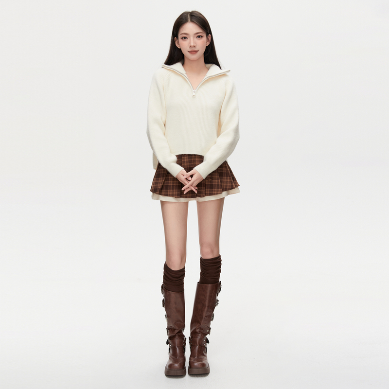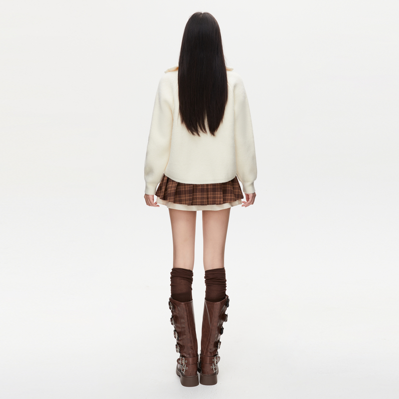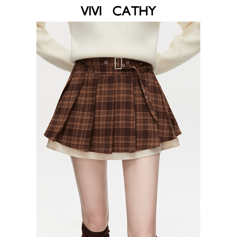 VIVICATHY2025秋复古学院风咖色格子百褶裙女甜辣JK高腰a字裙