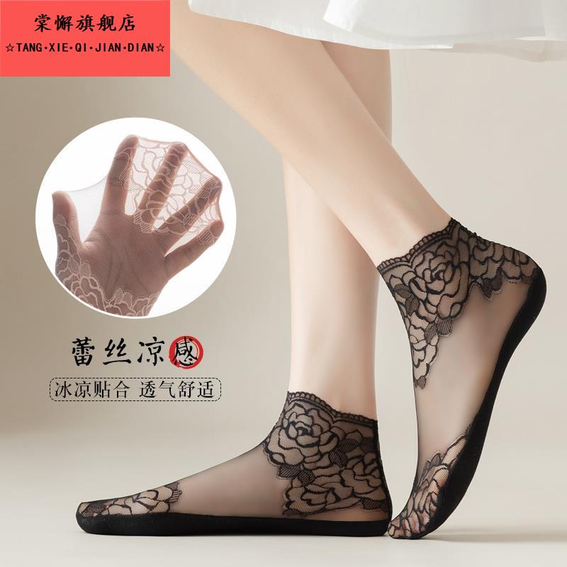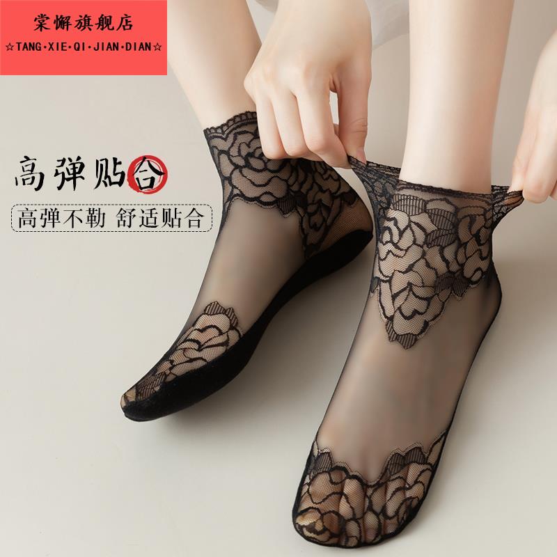 蕾丝袜子女花边中筒袜冬天纯棉底ins潮黑色冬季 加厚短丝袜隐形袜