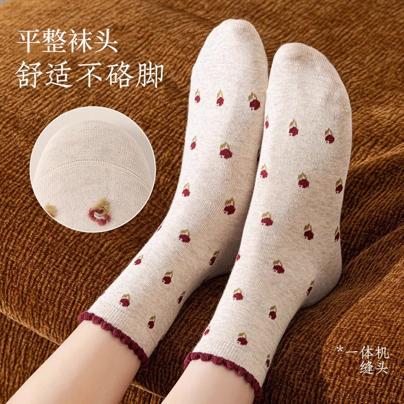 有棵树袜子纯棉女士秋冬7A抗菌透气中筒袜白色长筒袜 复古花纱